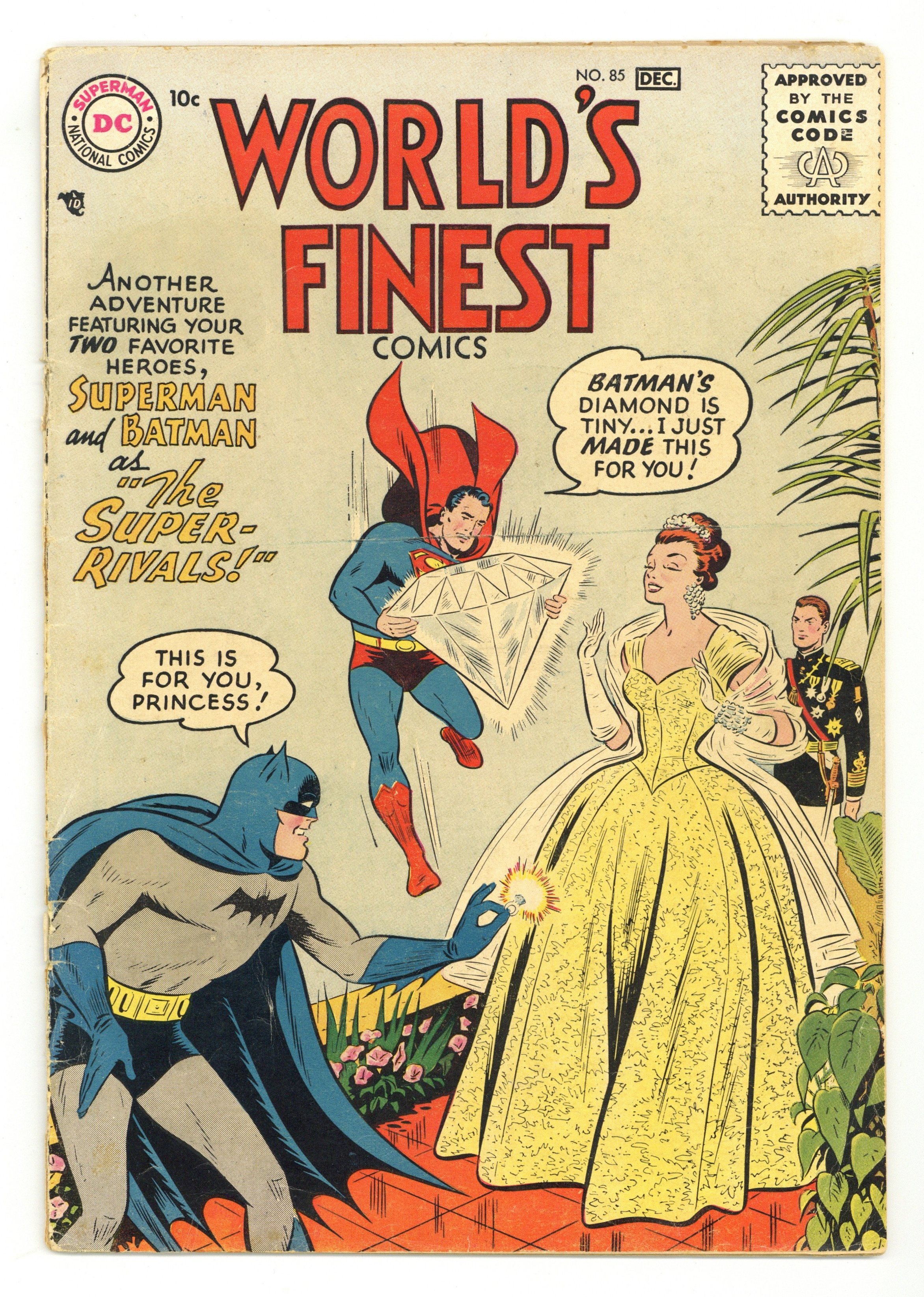Cover pencils by Dick Sprang, inks by Stan Kaye. The Super-Rivals, script by Edmond Hamilton, pencils by Curt Swan (splash) and Dick Sprang, inks by Curt Swan (Splash) and Stan Kaye; When Princess Varina comes to America, Batman and Superman seem to both have fallen in love with her and fight for her attention. The Frontier Destroyer starring Tomahawk, art by Fred Ray. Binky's Special Election Exhibit public service announcement starring Binky, script by Jack Schiff, art by Bob Oksner. I Hunted the Giant Turtles text story by Jack Miller [as Jerry Manson]. The Dangers from Tomorrow starring Green Arrow, art by George Papp. 36 Pages, Full Color. Cover price $0.10.