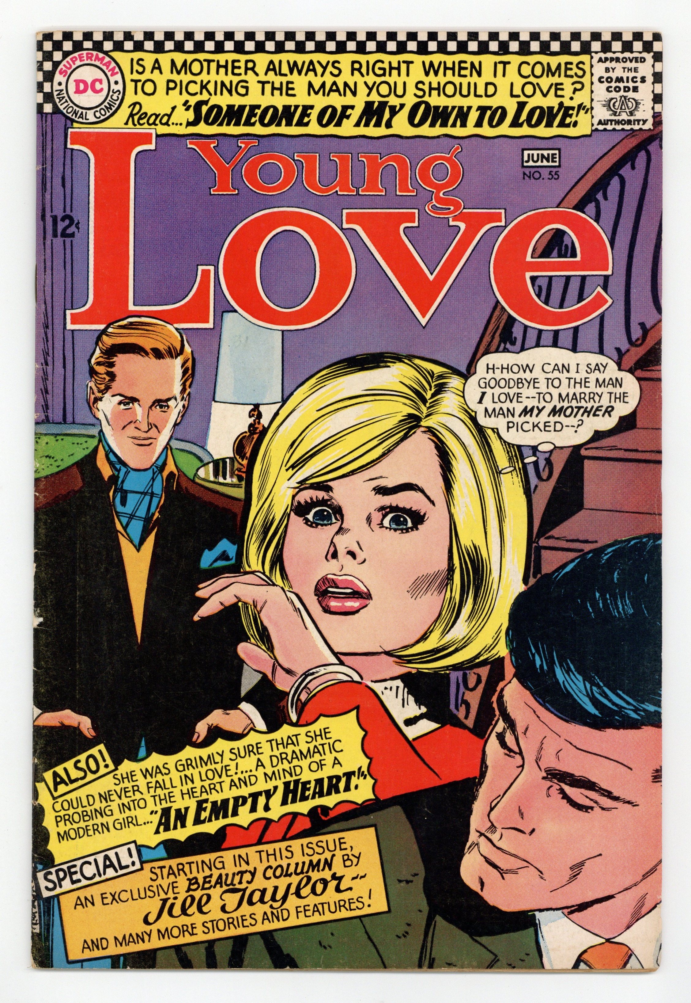 Cover by Jay Scott Pike. Stories by Phyllis Reed and Jack Miller. Art by Arthur Peddy, Jay Scott Pike and Bernard Sachs. She was grimly sure that she could never fall in love! It's a dramatic probing into the heart and mind of a modern girl in..."An Empty Heart"! Plus: Is a mother always right when it comes to picking the man you should love? Read..."Someone of My Own to Love"! Also: "Heart-Shy"; Romance in Fashion 2-pager "Collage"; You Can Be Beautiful 1-pager; and 1-page As Jane Ford Sees It advice column! 32 pages, full color. Cover price $0.12.