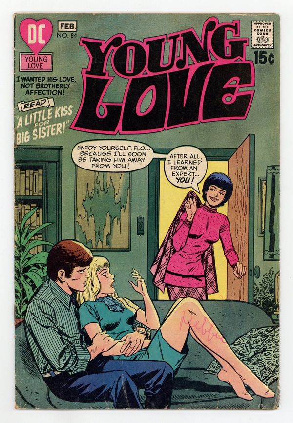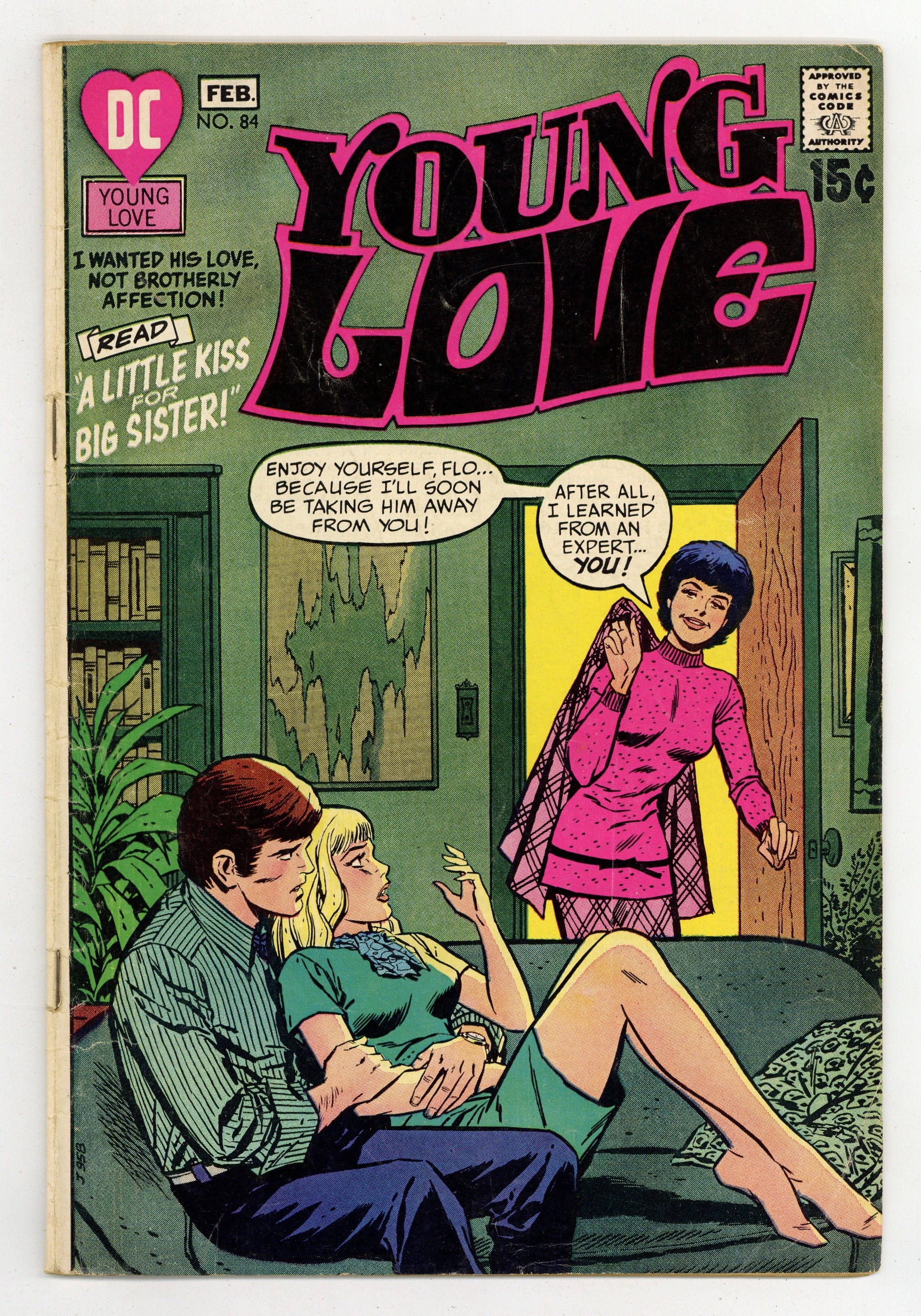 Cover pencils by Bill Draut. Stories by unknown. Art by Art Saaf, Jay Scott Pike, Tony Abruzzo, Lee Elias, Liz Berube, Bernard Sachs and unknown. Flo falls in love with her sister Jan's boyfriend Ralph, and since she's the nicer of the two, she eventually gets him in "A Little Kiss for Big Sister!" Plus: Jen has always blamed Skip for her sister's death, but when she finally learns that he was not responsible, she finds herself falling in love with him in "Get Out of My Heart!" Also: Belinda is shocked to find that her new boyfriend Eliot is the brother of her old boyfriend Van in the reprint story "A Proud Goodbye"! And: Uptight 1-pager; makeup tips in a Beauty on a Budget 1-pager; and 1-page As Jane Ford Sees It advice column! 32 pages, full color. Cover price $0.15.