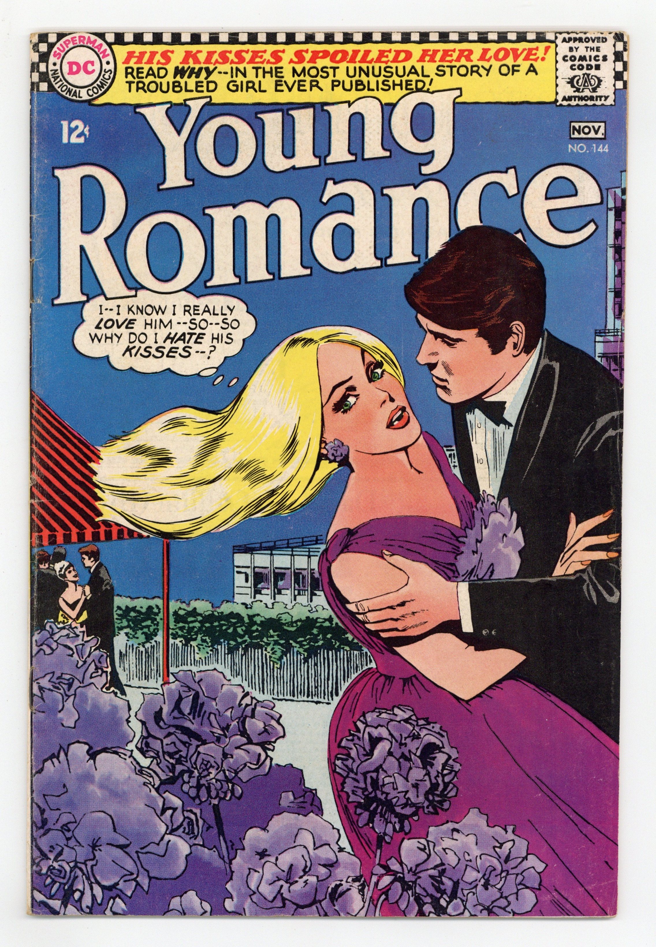 Cover pencils by Tony Abruzzo. Stories by unknown. Art by Gene Colan, Arthur Peddy, Tony Abruzzo, Bernard Sachs, Jay Scott Pike? and unknown. After Peter breaks up with Monica, every other man she is with eventually does something that reminds her of Peter and she has to break up with him. Years later she meets Peter again with his wife and suddenly realizes that she doesn't still love him after all in "Diary of a Broken Heart"! Plus: Cathy and Bonnie go on a vacation to Venice where each one meets a dashing Italian man. But before long, they've switched partners in "Romance -- Italian Style!" Also: Things always go well for Carla on dates, until the boy tries to kiss her and her feelings immediately change. Eventually she meets the right boy, whose kisses don't turn her off, in "I Hated His Love! I Hated His Kisses!" And: Hair and beauty tips in 1-page You Can Be Beautiful article! Plus: Laura Penn...Your Romance Reporter letters page. 32 pages, full color. Cover price $0.12.