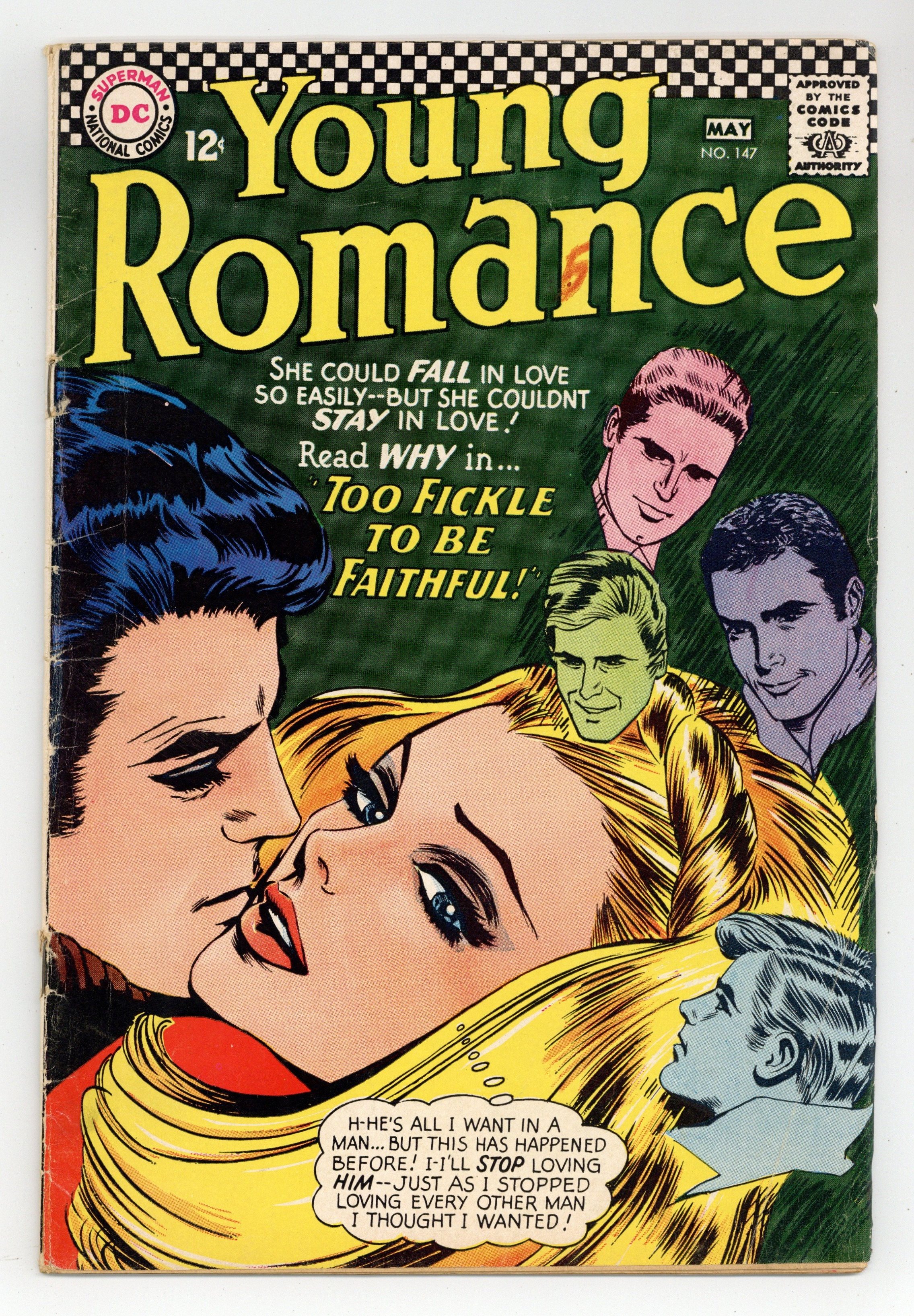 Cover by John Rosenberger? Stories by unknown. Art by John Rosenberger? and unknown. Nancy falls out of love as quickly as she falls in, until she finally meets the right guy in "Too Fickle to Be Faithful!" Plus: Sandy wonders why the handsome boy she wants to meet keeps ignoring her, but she finally realizes that he's just shy and that she has to make the first move in "Waiting for Love!" Also: Joanie and Rick are childhood friends who eventually realize, after dating other people, that they are meant to be together in "We'll Both Dream!" And: Illustrating paper dresses in Mad Mad Modes for Moderns 2-pager "[Wear and Tear]"! Plus: Laura Penn...Your Romance Reporter letters page. 32 pages, full color. Cover price $0.12.