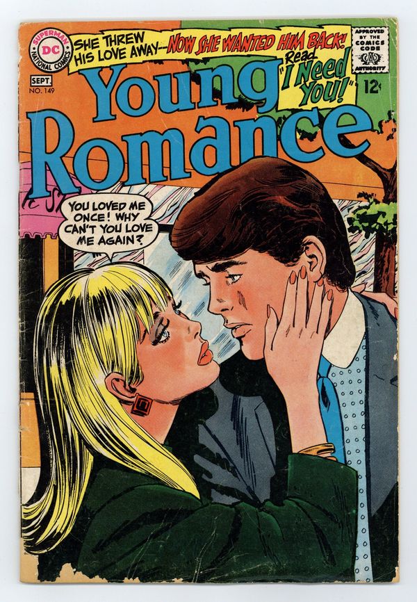 Cover by Jay Scott Pike. Stories by unknown. Art by Jay Scott Pike, John Rosenberger, Vince Colletta, Bernard Sachs and unknown. Barbara was raised by an aunt who really didn't want the responsibility. When Barbara's first boyfriend quickly falls out of love with her, she wonders if anyone will ever love her in "I Need You!" Plus: Everyone at the office thinks that Lucy and her boss Gary are a couple, but they are the last ones to realize it in "The Romance that Never Was!" And: Glenn loves Mindy but she can't wait to leave the farm community where they live. After she meets Jeremy, a pilot, Glenn realizes that he has to give up his dreams of being with her in "Stop-Over Love!" Also: The story of Rebecca Alkire, winner of the 1967 Miss American Teen-Ager pageant at Palisades Amusement Park, in the 2-pager "Miss American Teen-Ager"; Mad Mad Modes for Moderns 2-pager "What a Ginchy Idea!"; and Laura Penn...Your Romance Reporter letters page. 32 pages, full color. Cover price $0.12.