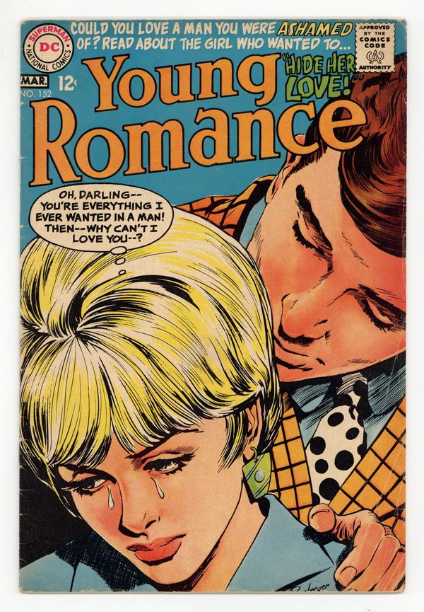 Cover pencils by John Rosenberger. Stories by unknown. Art by John Rosenberger, Bernard Sachs and unknown. Lita likes Tony but since he isn't particularly handsome or fun-loving she tries to deny her feelings for him in "Hide Her Love!" Plus: When Nan's journalist boyfriend Chris goes to Hollywood to cover the rising career of local girl Monica Day, Nan is afraid that he will fall in love with the beautiful starlet and forget about her in "All I Want Is You!" Also: Kay in interested in Edwin, the son of her employer, but learns that he is in love with another girl, Nicolette. When Edwin's brother Bill returns home, he tells Kay a surprising secret about Nicolette that changes everything in the reprint story "Nicolette"! And: Laura Penn...Your Romance Reporter letters page. 32 pages, full color. Cover price $0.12.
