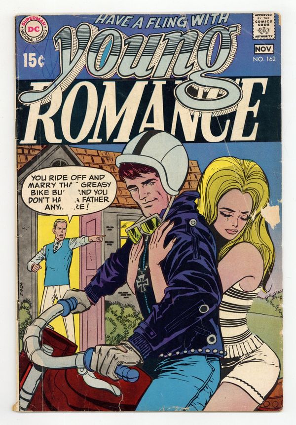$17.50Cover by Ric Estrada & Vince Colletta. Stories by Ric Estrada, Jack Miller and unknown. Art by Ric Estrada, Win Mortimer, Werner Roth, Vince Colletta and Murphy Anderson. If she rides off and marries that greasy bike bum, she won't have a father anymore! See what she does in..."Wheels of Passion"! Plus: Ginny can't help looking at other guys when she's out with Frank, which causes Frank to break up with her. Later, when she falls in love with Bill, she knows that her love is real this time because she has no interest in anyone else in "What Kind of Girl are You?" Also: 1-page Dates 'n' Mates fashion feature! And: Sylvia and Lee spot a house in the country and declare it their dream house, but can they afford it in the reprint story "Tears for a Dream"? Plus: Laura Penn...Your Romance Reporter letters page. 32 pages, full color. Cover price $0.15.
