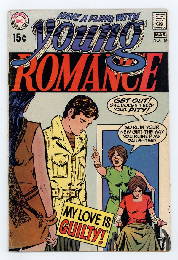 $23.50Cover inks by Vince Colletta. Stories by Robert Kanigher and unknown. Art by Alex Toth & Dick Giordano (as Ric Dano), John Celardo & Vince Colletta, Liz Berube and unknown. Concluding the story begun last issue: "Next Door to Love, Part Two"! Also featuring "Please...Don't Step on My Heart"! Plus: Dates 'n' Mates 1-pager "[You'll love 'em all...]"! And: Reprint? story "I Laughed at Love"! Also: Laura Penn...Your Romance Reporter letters page. 32 pages, full color. Cover price $0.15.