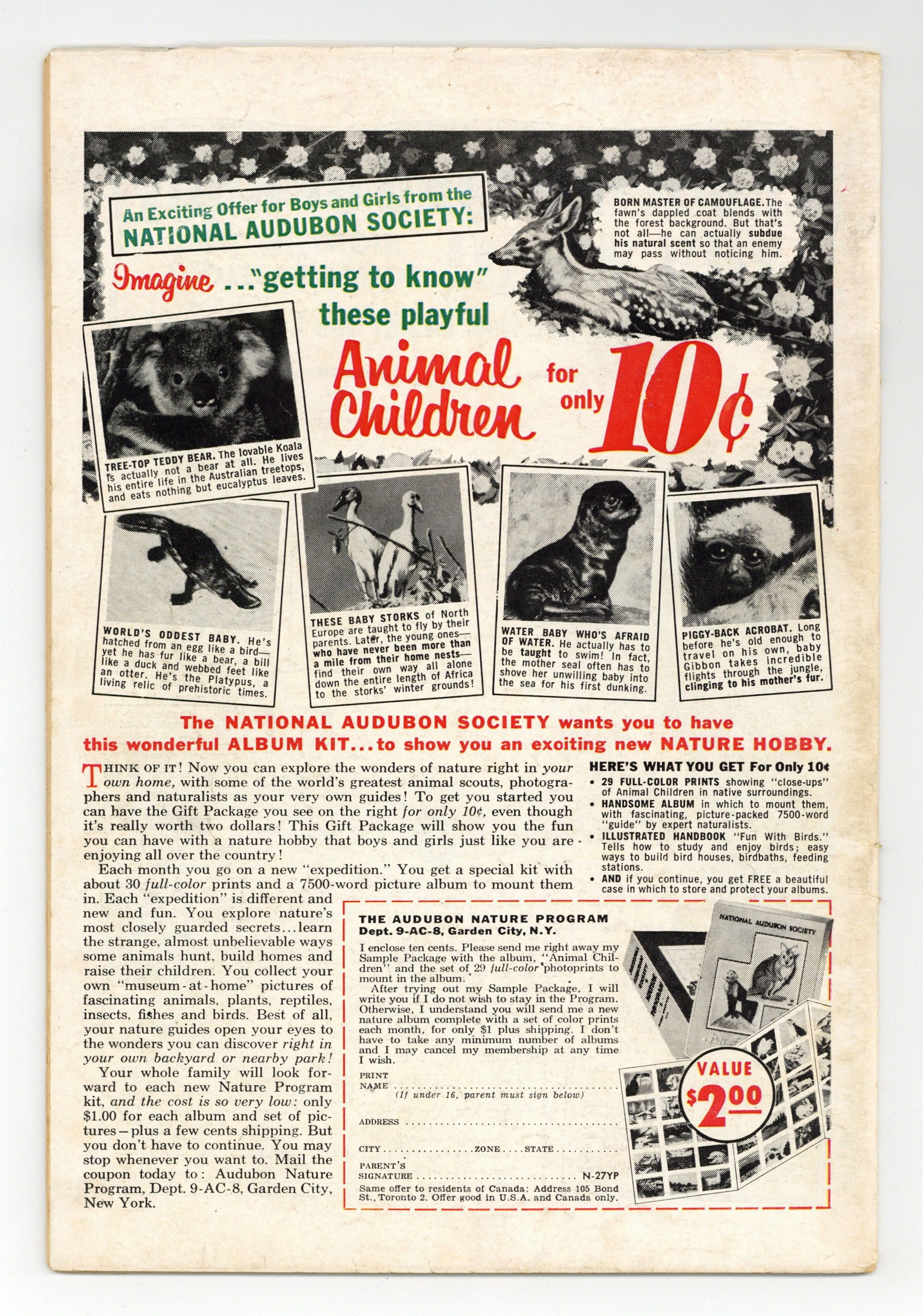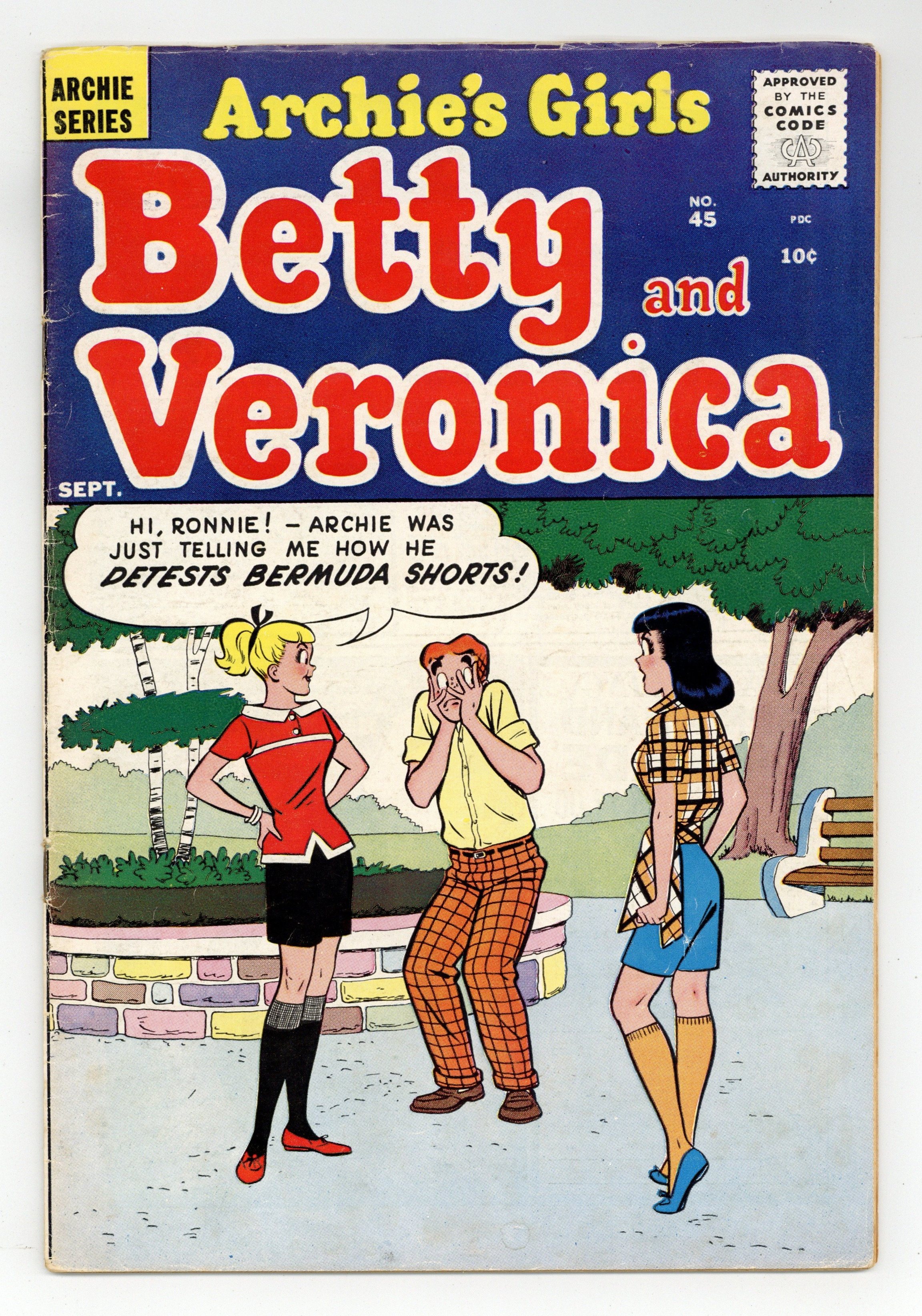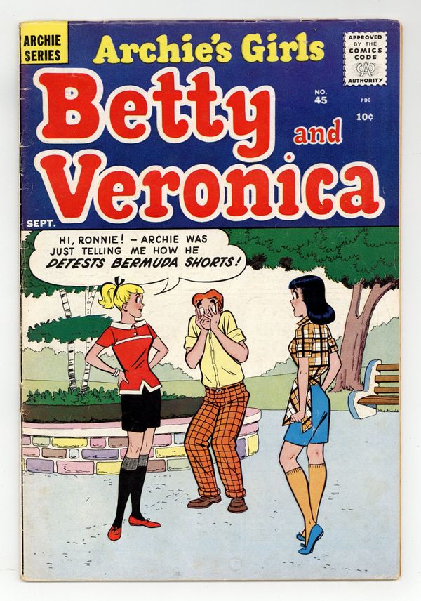 The Go-Between; When Archie and Veronica stop speaking to each other, Betty passes messages between them. Article on recording star, Fabian. Teen Wagers; Betty and Archie donate their time doing odd jobs for charity. Past Masters, script by Frank Doyle, pencils by Dan DeCarlo, inks by Rudy Lapick; Betty decides that the best way to get the girls in her class to learn history is to gossip about it. Time Weds For No One; Betty and Veronica overhear a conversation that make them think that Mr. Weatherbee has proposed to Miss Grundy and the only thing stopping the wedding is the lack of a gown. 36 pgs. $0.10. Cover price $0.12.