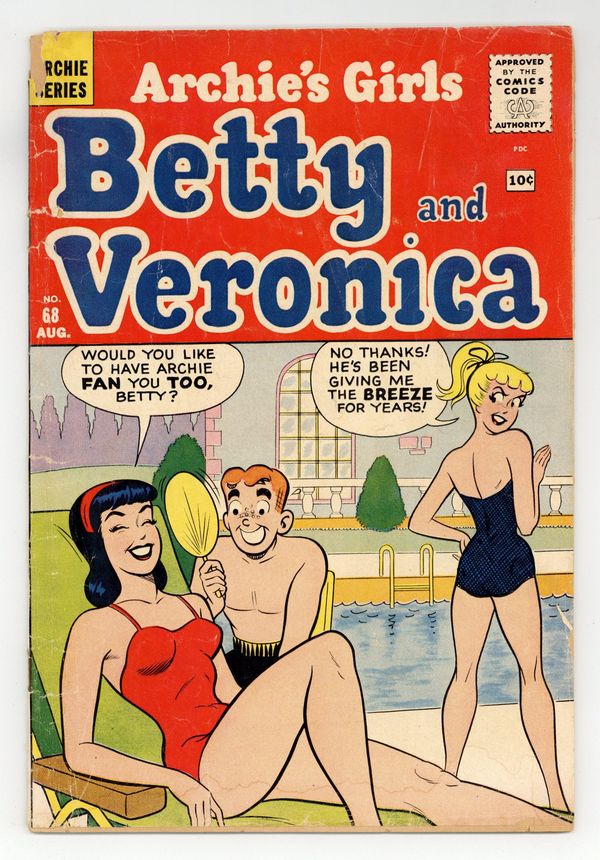 Cover art by Bob White. Take Me To Your Leader, script by Frank Doyle, pencils by Dan DeCarlo, inks by Rudy Lapick; Betty becomes a beatnik, complete with bongo drums, progressive jazz music and an unkempt sweater. Saved By the Belle, script by Frank Doyle, pencils by Dan DeCarlo, inks by Rudy Lapick; Archie tries to make time with the sexy new man-eater in town, Viv Laverne; When Veronica is about to catch them together, Betty hides Viv and makes it look like she's the one who is secretly dating Archie. The Disinterested, script by Frank Doyle, pencils by Dan DeCarlo, inks by Rudy Lapick; When Betty has a date, Veronica spends the entire night stalking them to make sure that her date isn't actually with Archie. 36 pgs. $0.10. Cover price $0.12.