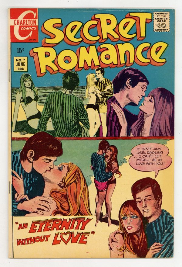 Published Jun 1970 by Charlton Comics Group.$14.00Stories by unknown. Art by Fred Himes, Charles Nicholas? & Vince Alascia? and unknown. Featuring: "I Love You, You Fink!"; "Waiting For Love"; and "An Eternity Without Love"! Plus: advice page "Just Jeannette" by Jeannette Copeland. 32 pages, full color. Cover price $0.15.