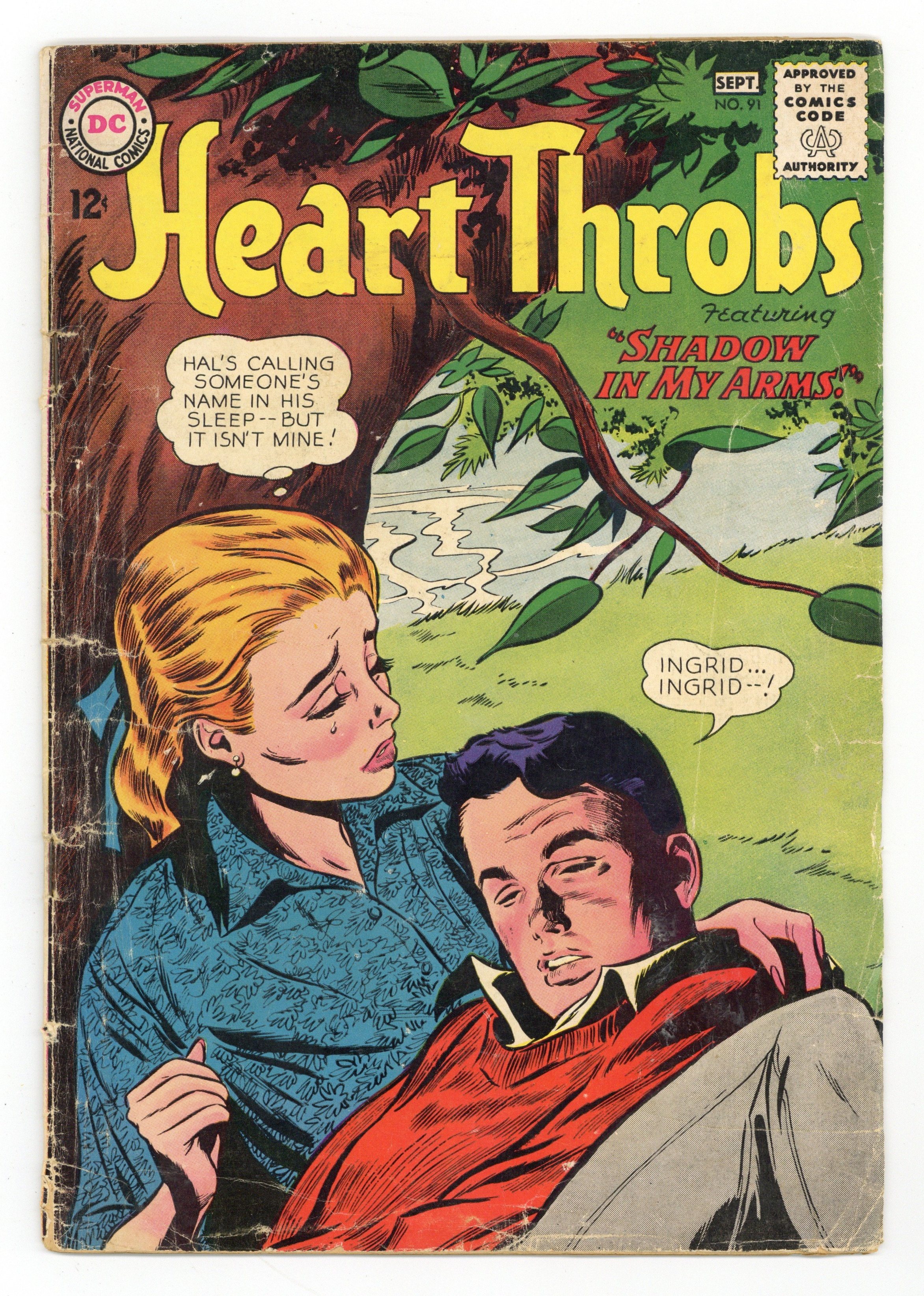 Cover pencils by Gene Colan. Stories by Bob Kanigher and unknown. Art by Gene Colan, Tony Abruzzo, John Rosenberger and unknown. Linda meets a handsome stranger and falls in love, but she fears that a woman from his past will return to doom their relationship in "Shadow in My Arms"! Plus: Marianne worries that her artist boyfriend Chris is not ambitious enough and she leaves him for Dave, who can help her career as a model. Eventually she realizes that it's Chris that she truly loves in "Chain Around My Heart!" And: Ginny thinks that her sister Tina is out to steal Ginny's boyfriend Billy, but Tina really wants to prove that Billy can't be trusted in "Billy Was Mine!" Also: 1-page Romance in Fashion filler "A Summer's Look"; 1-page Romance in Fashion filler "Sun Living"; 2 pages of poetry by John Bryson Eulenberg, Baria S. Perez, Dorothy Enloe and Rosemary Pellegrini; and 1-page filler "Wedding Customs Old and New"! 32 pages, full color. Cover price $0.12.
