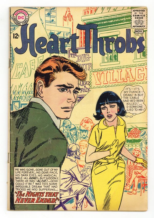 Cover by Tony Abruzzo. Stories by unknown. Art by Tony Abruzzo, John Rosenberger and Win Mortimer? & unknown. Michele's boss encourages her to date his son Dean, but after she and Dean become engaged she learns that Dean has been killed in an accident. It turns out to be a ruse staged by his stepmother to keep them apart in "The Nights That Never Ended!" Plus: Andrea keeps stealing Felice's boyfriends but she finally meets Derek, who sees through Andrea's games in "Don't Speak to Me of Love!" And: Kathy has been looking forward to her vacation with her boyfriend Lee, but when she meets his friend Quent and falls for him, she realizes that she doesn't really love Lee after all in "The Edge of Love"! Also: 2 pages of poetry by Karen Loving, La Nelle Harvey, Freda Wheatley, Marlene Krilosky, Evelyn Goebel and Connie Shifteth. 32 pages, full color. Cover price $0.12.