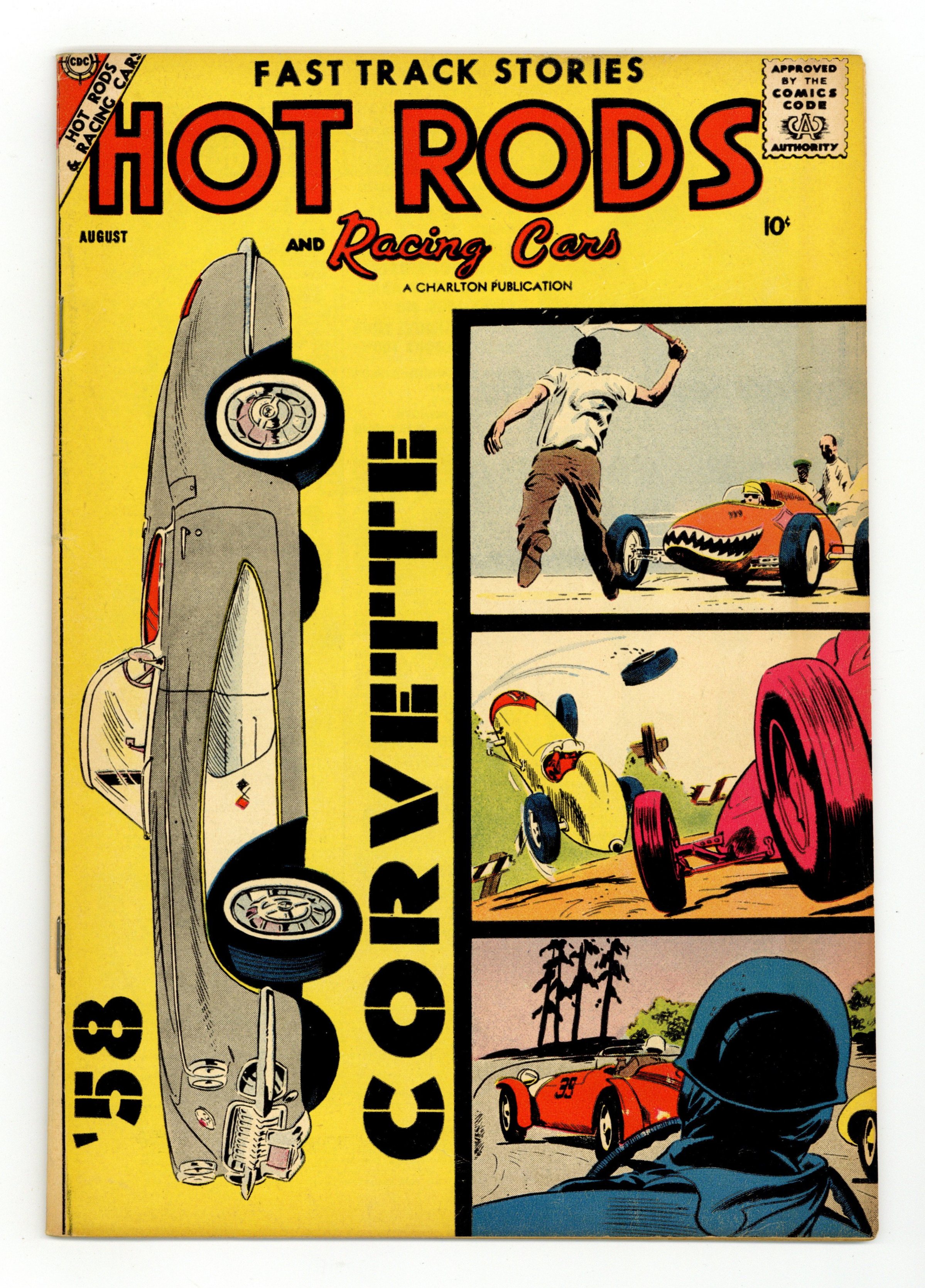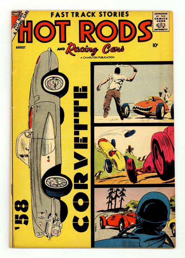 1958 Corvette Convertible cover, pin-up, and feature. In order of appearance: "The 500 Mile Classic"; art by Paul Reinman; Corvette pin-up and feature; "Reckless Redhead" and "Sportsmanship" art by Dick Malmgren; "Why Do They Do It?"; and "Novice Notes, Getting the Engine out of Your Car". "Car Conference" illustrated text article. 36 pages. Full color. Cover price $0.10.