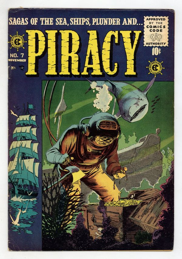 Cover by George Evans. Stories by Carl Wessler and others. Art by Bernie Krigstein, Graham Ingels, George Evans, and Reed Crandall. One of EC Comics' late New Direction titles, a response to the new Comics Code, featuring piracy on the high seas. Reed Crandall illustrates the saga of two competing pirate captains, each trying to steal the other's treasure. A kindly fisherman's heroic deed impresses everyone but his shrewish wife, with art by Graham Ingels. A ship is lost with a fortune in gold and jewels, but a captain suspects foul play, in a modern-day sunken-treasure story (and cover) by George Evans. Partners; Prologue; Up the River; Johns Reward; Temptation. Final issue of the series. 32 pages, Full Color. Cover price $0.10.