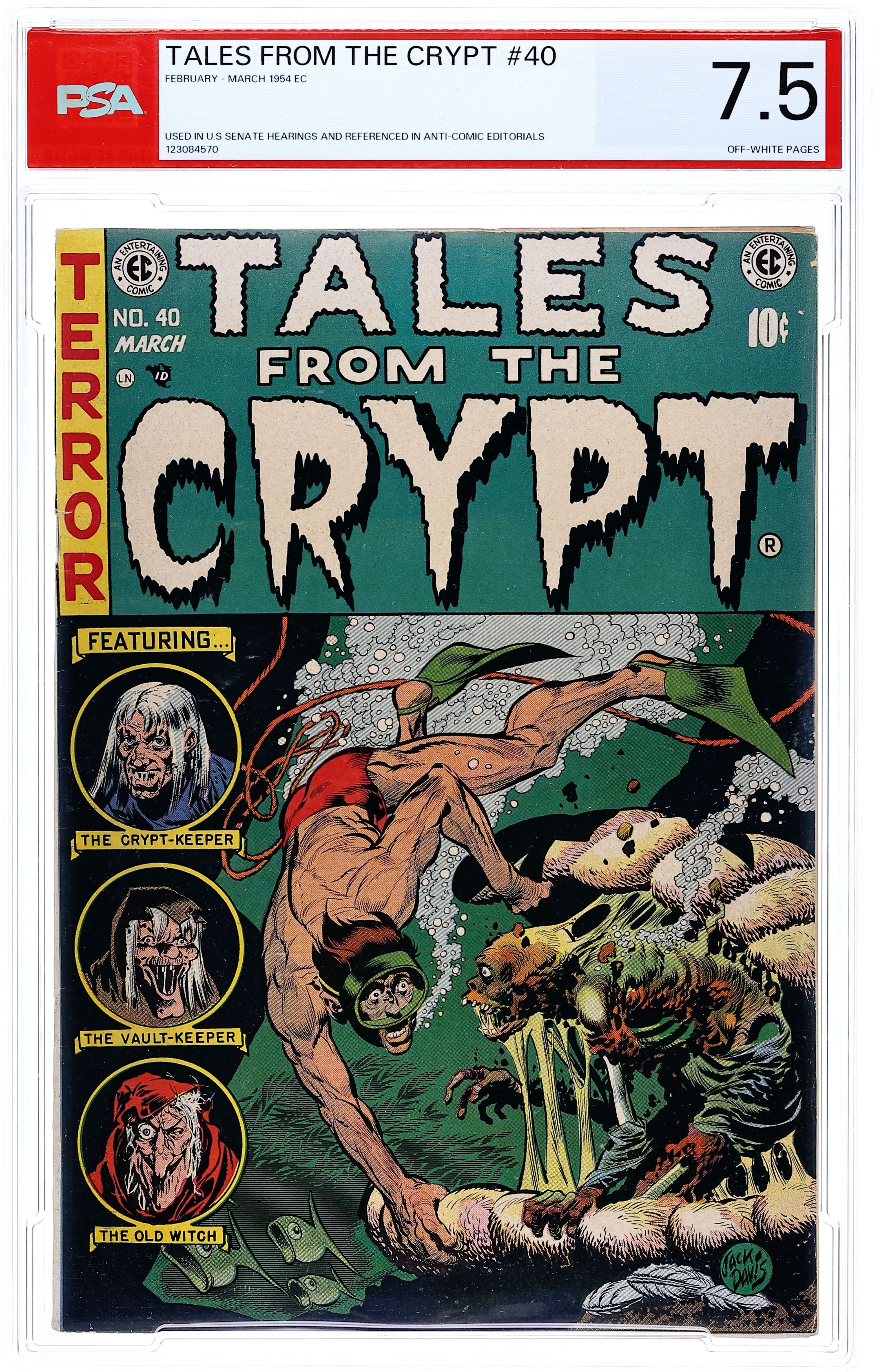 Cover by Jack Davis. "Food For Thought," script by Al Feldstein, art by Jack Davis; A woman plots to run away with the circus animal trainer because her husband, even though he can project his thoughts to her which they use as their act, does not love her. "Pearly To Dead," script by Al Feldstein, art by George Evans; Two navy divers discover a pearl bed while placing demo charges and make plans to go back for them after the war ends. "Choice!" text story. "Prairie Schooner," script by Al Feldstein, art by Bernie Krigstein; A madman converts a house into a ship in the middle of a prairie. "Half-Baked!", script by Al Feldstein, art by Graham Ingels; A man who enjoys tormenting lobster ends up in a car crash where the steering column disembowels him and the flames that erupt broil him alive. 36 pgs., full color. $0.10. Cover price $0.10.