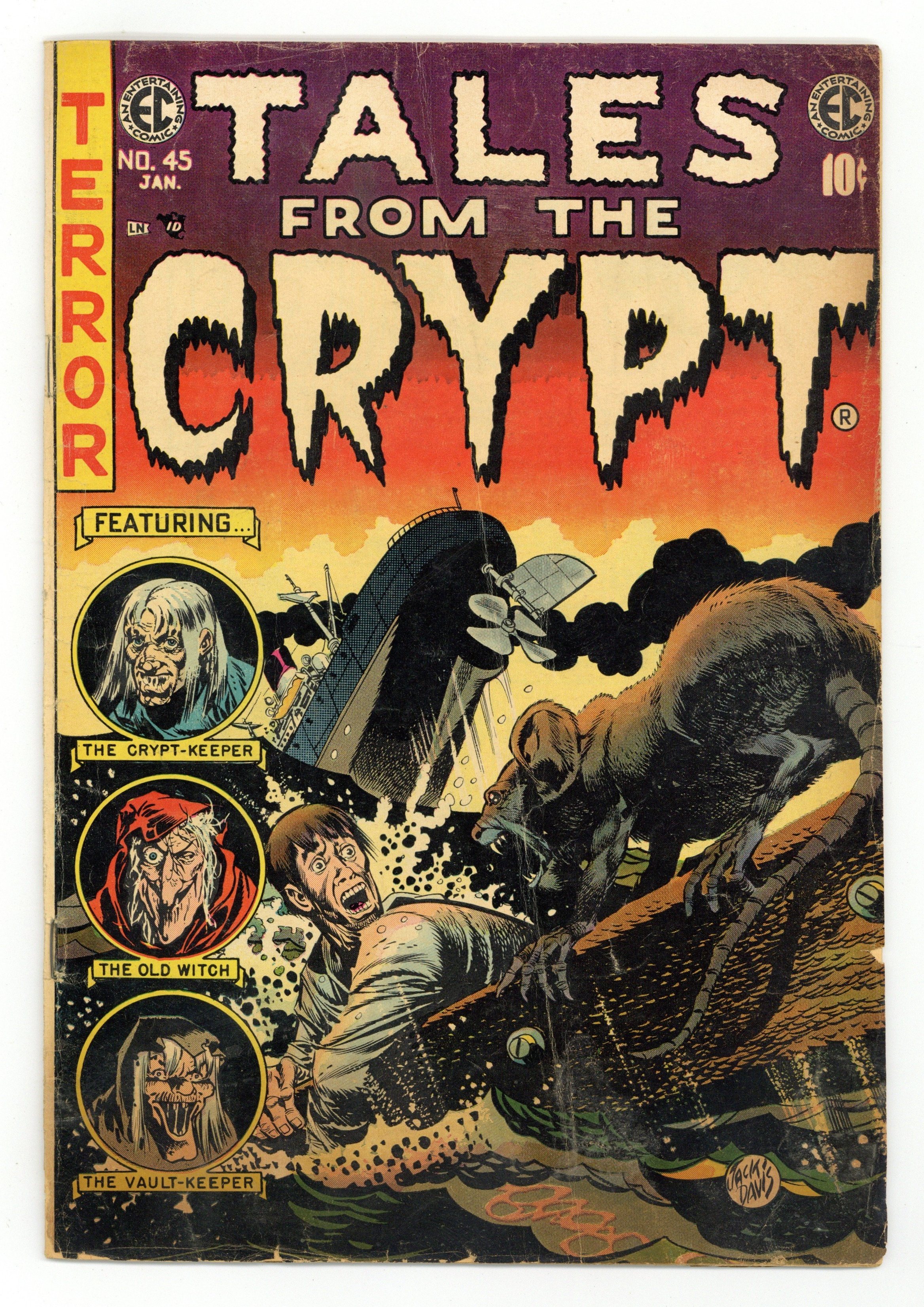 Cover by Jack Davis. "Telescope," script by Carl Wessler, art by Jack Davis; A man and a rat from a ship wreck wash up on an island and eye each other warily as the only food source available. "The Substitute," script by Carl Wessler, art by Jack Kamen; A man assumes that the body of the governor of the penal colony he is a prisoner in will be sent back to Paris, so he kills him with a poisoned dart from a blowgun and makes plans to switch places with his body in the casket. "Squeeze Play" text story. "Murder Dream," script by Carl Wessler, art by Bernard Krigstein; A maniac ax-murderer assumes his victim's identity in his dreams until he is compelled to return to the scene of the crime to murder the victim's wife as well. "The Switch," script by Carl Wessler, art by Graham Ingels; An old millionaire falls in love with a young woman but he doesn't want her to marry him for his money so he tells her he's poor. One-page editorial on the Senate Subcommittee on Juvenile Delinquency investigation into the comic industry. Two-page montage of the EC office with caricatures of the artists by Marie Severin. 36 pgs., full color. $0.10. Cover price $0.10.