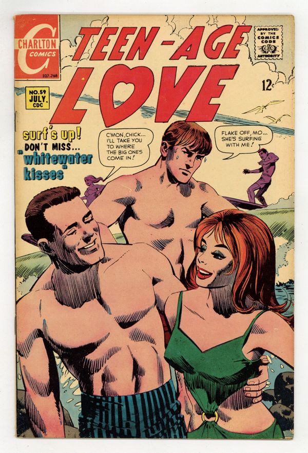 Tags: Print Run StatisticsPublished Jul 1968 by Charlton Comics Group.$5.20Cover by Dick Giordano. Stories and art by Charles Nicholas, Vince Alascia, Nestor Olivera, and Vince Colletta. Charlton's long-running romance comic coincides with the blossoming of America's teen culture from the 1950s to the 1970s. After Dorrie's beauty blossoms and her father lets her wear miniskirts, popular Arnie asks her to the prom, but Arnie's ex Anita isn't going to be happy about that. A love triangle unfolds against the backdrop of the 1960s surfing scene. Plus romantic advice for 1960s teens, and a vintage ad for "real" Hawaiian muu muu dresses. This Morning I Woke Up Beautiful; Don't Call Us Evil; Teen-Age Troubles; Whitewater Kisses. 32 pages, Full Color. Cover price $0.12.