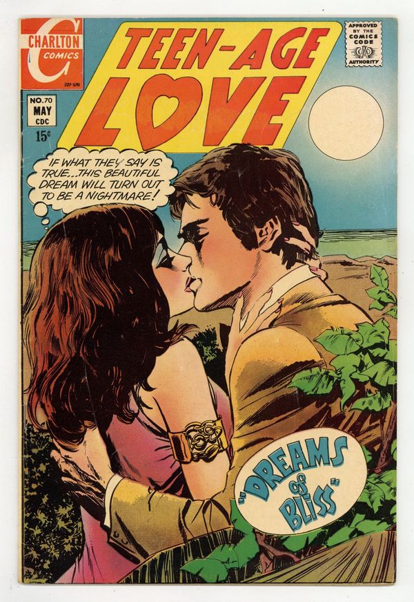 Tags: Print Run StatisticsPublished May 1970 by Charlton Comics Group.$10.00Stories and art by Charles Nicholas, Vince Alascia, and Tony Tallarico. Charlton's long-running romance comic coincides with the blossoming of America's teen culture from the 1950s to the 1970s. Ted has trouble adjusting to his new life in Colorado, but country girl Ruth is happy to help him learn to ride horses and enjoy nature. Charlton's romantic hippie hero, Jonnie Love, finds trouble with a biker gang after he meets lovely Nina on his latest wanderings. Tenderfoot's Kisses; Just Jeannette; Dreams of Bliss; Jonnie Love: An Angel's Arms. 32 pages, Full Color. Cover price $0.15.