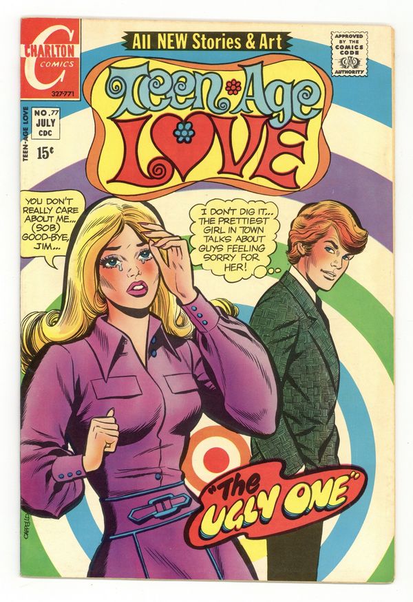 Published Jul 1971 by Charlton Comics Group.$46.00Cover by Art Cappello. Stories and art by Don Perlin, Charles Nicholas, Vince Alascia, and Vince Colletta. Charlton's long-running romance comic coincides with the blossoming of America's teen culture from the 1950s to the 1970s. While at one of her cousin Ruthie's "mod" parties, Gina meets Blake, who's totally "marvie," and he seems to think she is too. Luanne is dating Sam, but she develops a yen for Anita's boyfriend Walt, in a story with art by future Marvel legend Don Perlin. Jim doesn't understand how a beautiful woman can consider herself "the ugly one." Where It Ain't at; Oh, Howard; When He's Mine!; Teen-Age Troubles; The Ugly One! 32 pages, Full Color. Cover price $0.15.