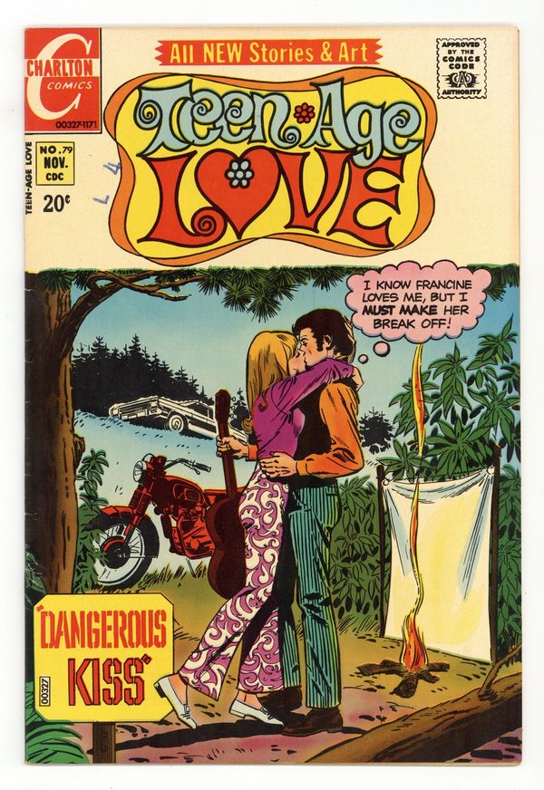 Published 1971 by Charlton Comics Group.$33.00Cover by David Mangiarotti and Jose Luis Garcia-Lopez. Stories and art by Jose Luis Garcia-Lopez, David Mangiarotti, Charles Nicholas, Vince Alascia, Art Cappello and Antonio Colmeiro. Charlton's long-running romance comic coincides with the blossoming of America's teen culture from the 1950s to the 1970s. Heartbroken after losing Ted in Vietnam, Gina doesn't know if she can ever love again, but then she meets Lew. Charlton's romantic hippie hero, Jonnie Love, is kidnapped after interrupting a robbery. But fellow hostage Francine helps him engineer their escape, in a story with early art by future DC artist Jose Luis Garcia-Lopez. A Place for Crying; Next Door to Heartbreak; A Sweet Memory!; Just Jeannette; Jonnie Love: Dangerous Kiss. 32 pages, Full Color. Cover price $0.20.