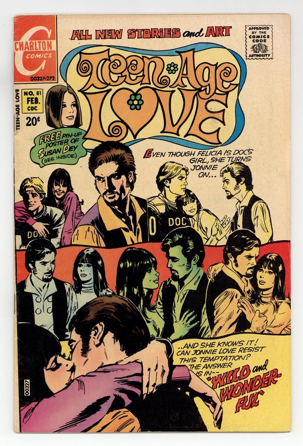 Published Feb 1971 by Charlton Comics Group.$8.00Cover by Art Cappello and Sal Gentile. Stories and art by Torre Repiso, Charles Nicholas, Vince Alascia, and Don Sherwood. Charlton's long-running romance comic coincides with the blossoming of America's teen culture from the 1950s to the 1970s. Barbara gets help from handsome new neighbor Bill, but it's important to her that he sees her as a capable person. Charlton's romantic hippie hero, Jonnie Love, gets hassled by Doc after Doc's gal Felicia falls for Jonnie. Plus a pin-up of 1970s teen heartthrob Susan Dey, star of The Partridge Family. Take Him from Her; Susan Dey; The Cheat; Duffy's Girl; Just Jeannette; Jonnie Love: Wild and Wonderful. 32 pages, Full Color. Cover price $0.20.