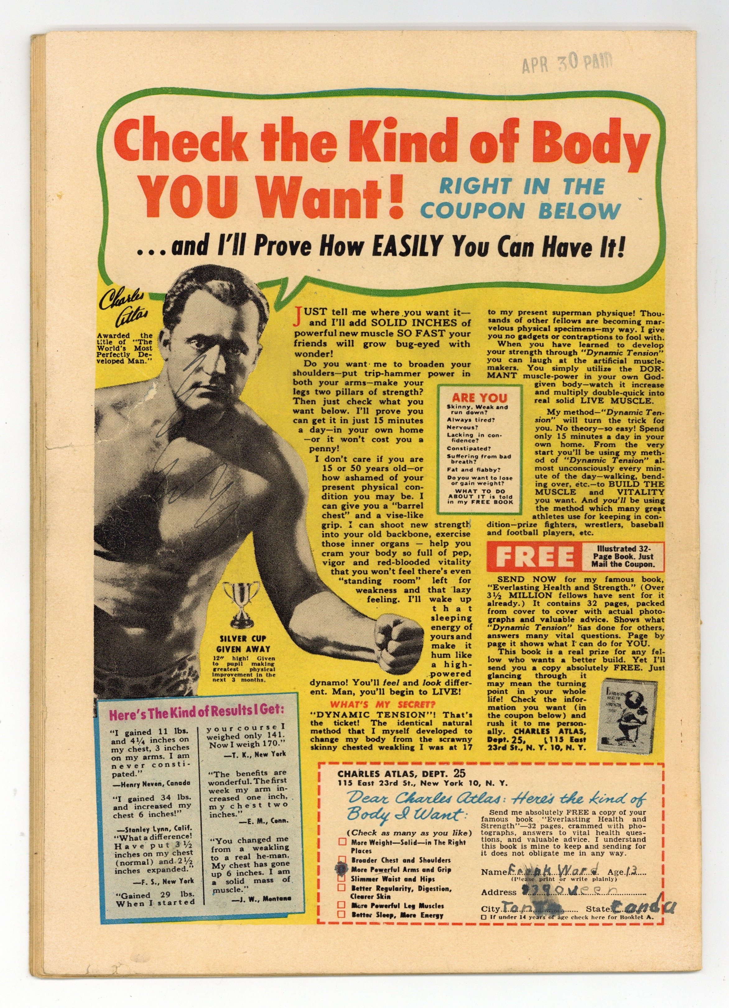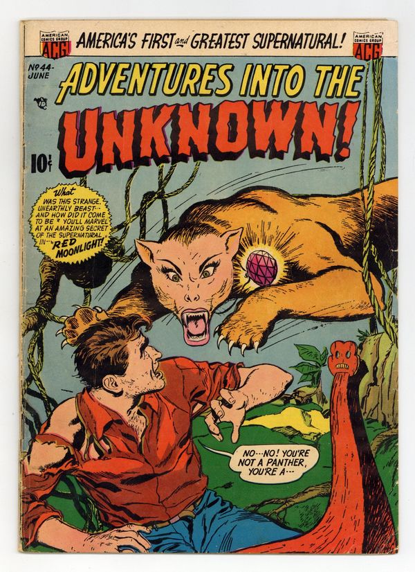 "Red Moonlight," "The Creeper," "The Phantom Fiend," and "The Devil and the War Bride." Edited by Richard E. Hughes. Cover by Ken Bald. Stories by Jon Blummer, Ken Bald, Paul Gattuso, and Pete Riss. Spine-chilling tales of suspense, horror, and the supernatural—prepare yourself for Adventures into the Unknown! 36 pages, full color. $0.10. Cover price $0.10.