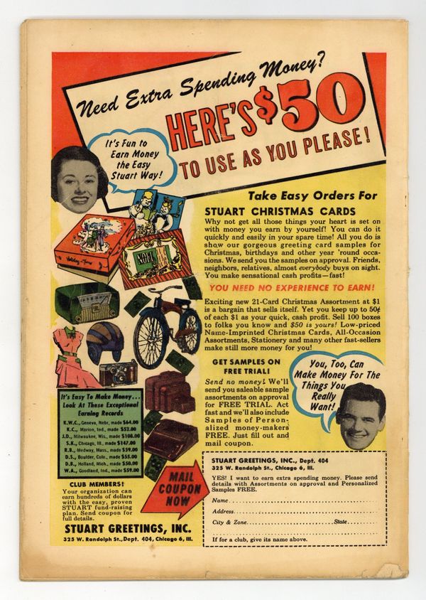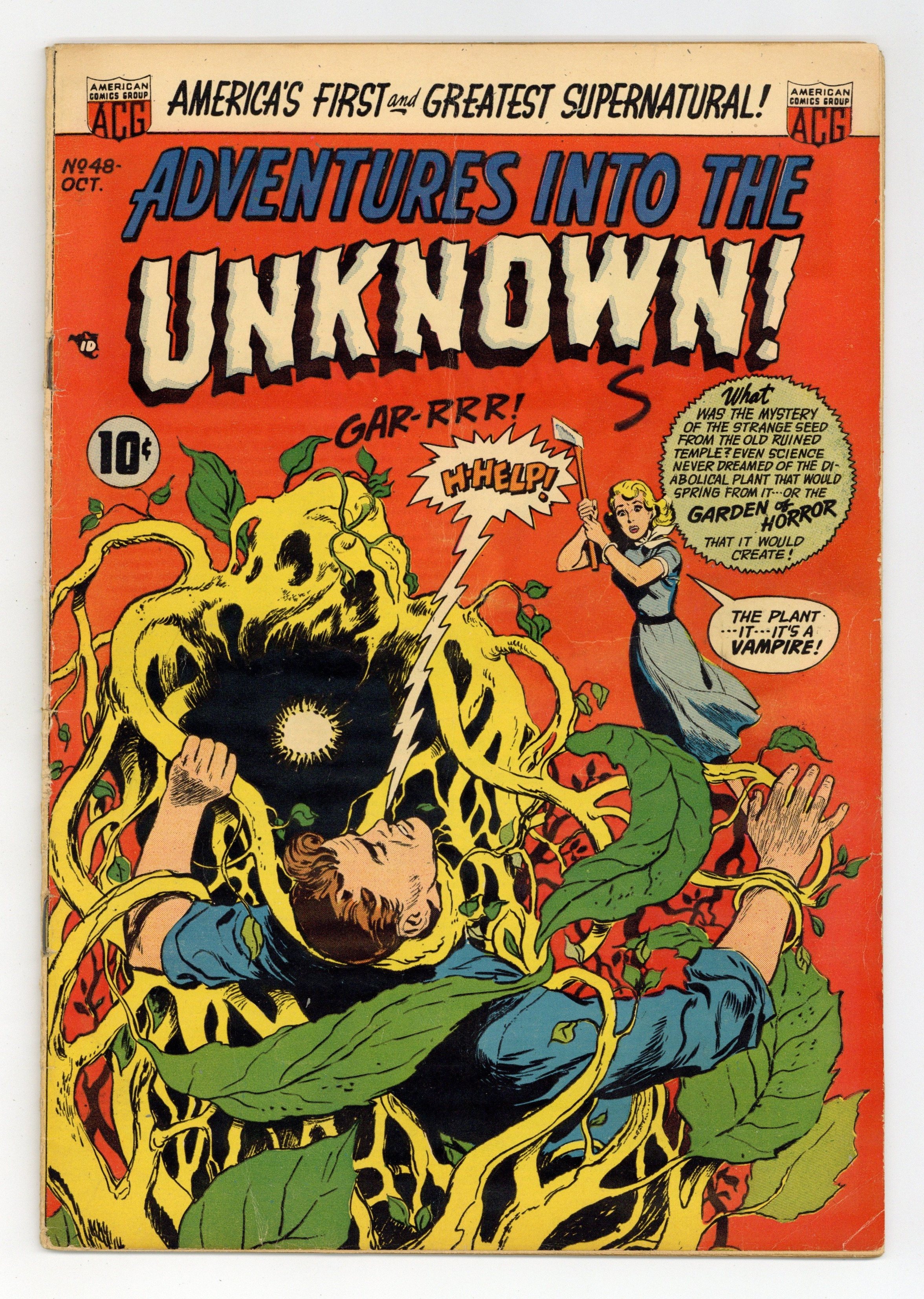 Edited by Richard E. Hughes. Cover by Ken Bald. Stories by Bob Forgione, Lin Streeter, Harry Lazarus, Edvard Moritz, and Art Gates. Spine-chilling tales of suspense, horror, and the supernatural—prepare yourself for Adventures into the Unknown! 36 pages, full color. $0.10. Cover price $0.10.