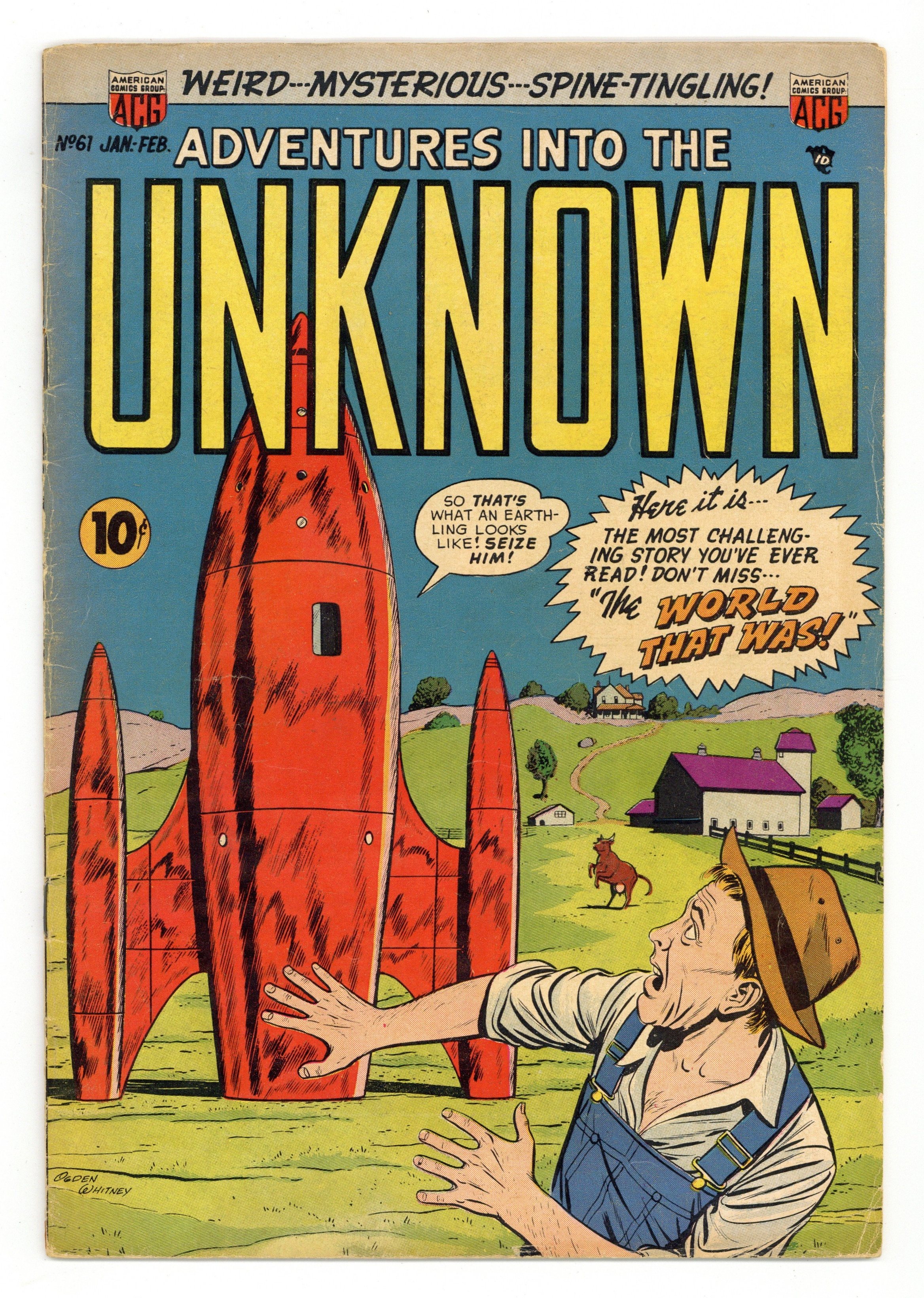 Edited by Richard E. Hughes. Cover by Ogden Whitney. Stories by Ken Landau, Ogden Whitney, John Rosenberger, and Harry Lazarus. Spine-chilling tales of suspense, horror, and the supernatural—prepare yourself for Adventures into the Unknown! 36 pages, full color. $0.10. Cover price $0.10.