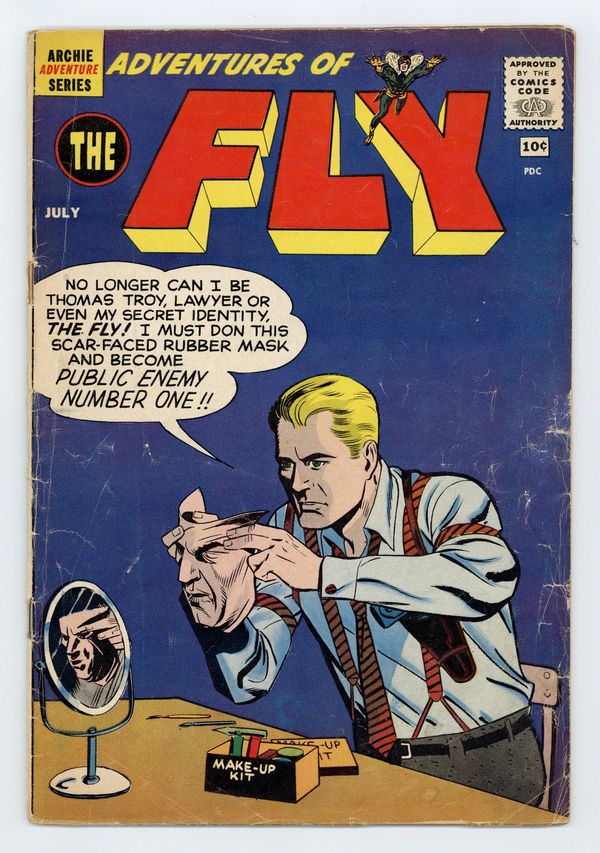 Edited by Victor Gorelick. Cover by John Giunta. Stories by Robert Bernstein and John Giunta. Archie Comics amiable and agile super-hero The Fly battles an assortment of nefarious villains, including Thomas Troy, Gangster. In one story, The Fly teams with the Black Hood. Bobby Bell's Judo Page. 36 pages, full color. $0.10. Cover price $0.10.