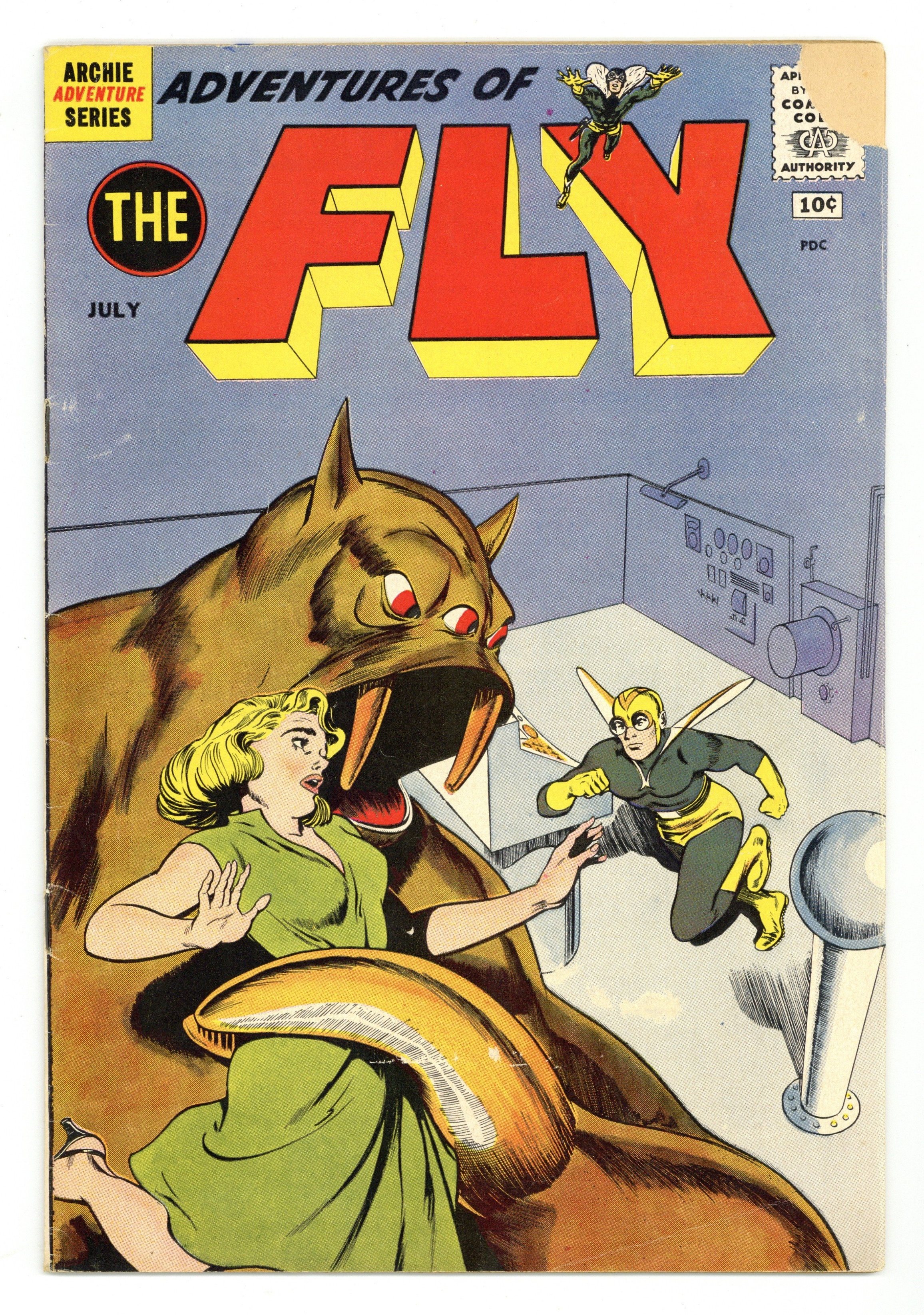 Edited by Victor Gorelick. Cover art by John Rosenberger. "The Tiger Genie," script by Robert Bernstein, art by John Rosenberger; Gang leader Rance unleashes a genie to defeat the Fly. "The Lady and The Monster," script by Robert Bernstein, art by John Rosenberger; After actress Kim Brand notes that the aliens in her debut picture are imaginary, the Fly takes her to see a real inhabitant of Saturn; Professor Jahke's robot has all the powers and characteristics of a Saturnian. "The Augean Cattle" The Trials of Hercules text story. The Jaguar house ad. "The Villain From the Future," script by Robert Bernstein, art by John Rosenberger; A murderer from 2261 travels 300 years back in time to collect two million dollars from a 1958 bank robbery; The Fly returns him to his own time with the help of insects in the future. 36 pgs., full color. Cover price $0.10.