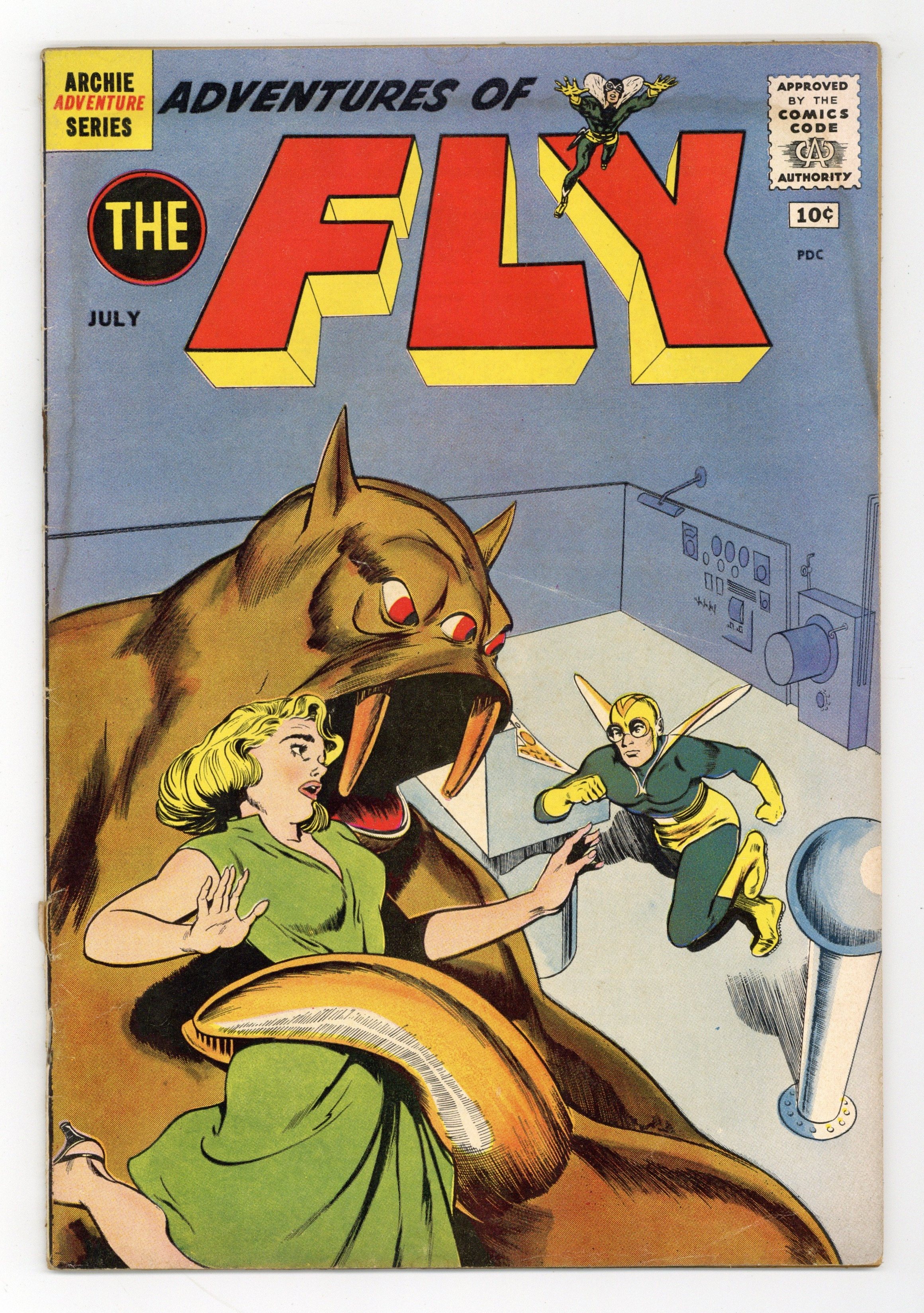 Published Jul 1961 by Archie Publications.$10.75Edited by Victor Gorelick. Cover art by John Rosenberger. "The Tiger Genie," script by Robert Bernstein, art by John Rosenberger; Gang leader Rance unleashes a genie to defeat the Fly. "The Lady and The Monster," script by Robert Bernstein, art by John Rosenberger; After actress Kim Brand notes that the aliens in her debut picture are imaginary, the Fly takes her to see a real inhabitant of Saturn; Professor Jahke's robot has all the powers and characteristics of a Saturnian. "The Augean Cattle" The Trials of Hercules text story. The Jaguar house ad. "The Villain From the Future," script by Robert Bernstein, art by John Rosenberger; A murderer from 2261 travels 300 years back in time to collect two million dollars from a 1958 bank robbery; The Fly returns him to his own time with the help of insects in the future. 36 pgs., full color. Cover price $0.10.