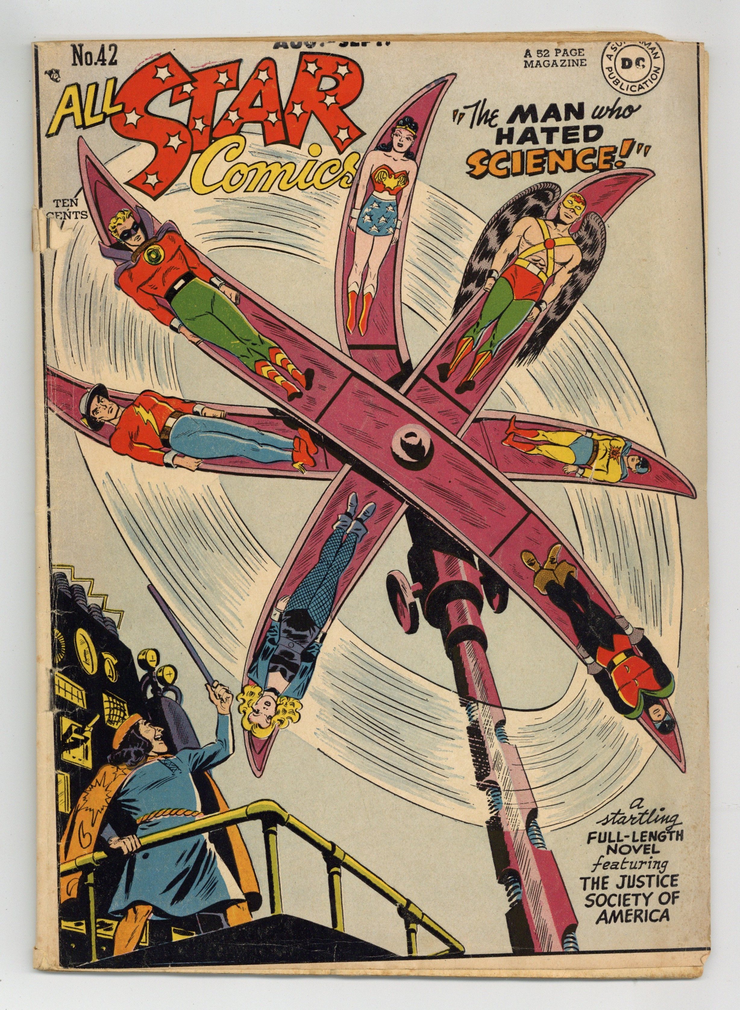 The Justice Society of America battles "The Man Who Hated Science!" The Atom and Hawkman don new costumes. Script by John Broome, pencils by Arthur Peddy, inks by Berhard Sachs. Back-up story, "Johnny Peril's Surprise Story!" Two-page text story, "Descent Into Wonderland." Irwin Hasen cover. 52 Pages, Full Color. Cover price $0.10.