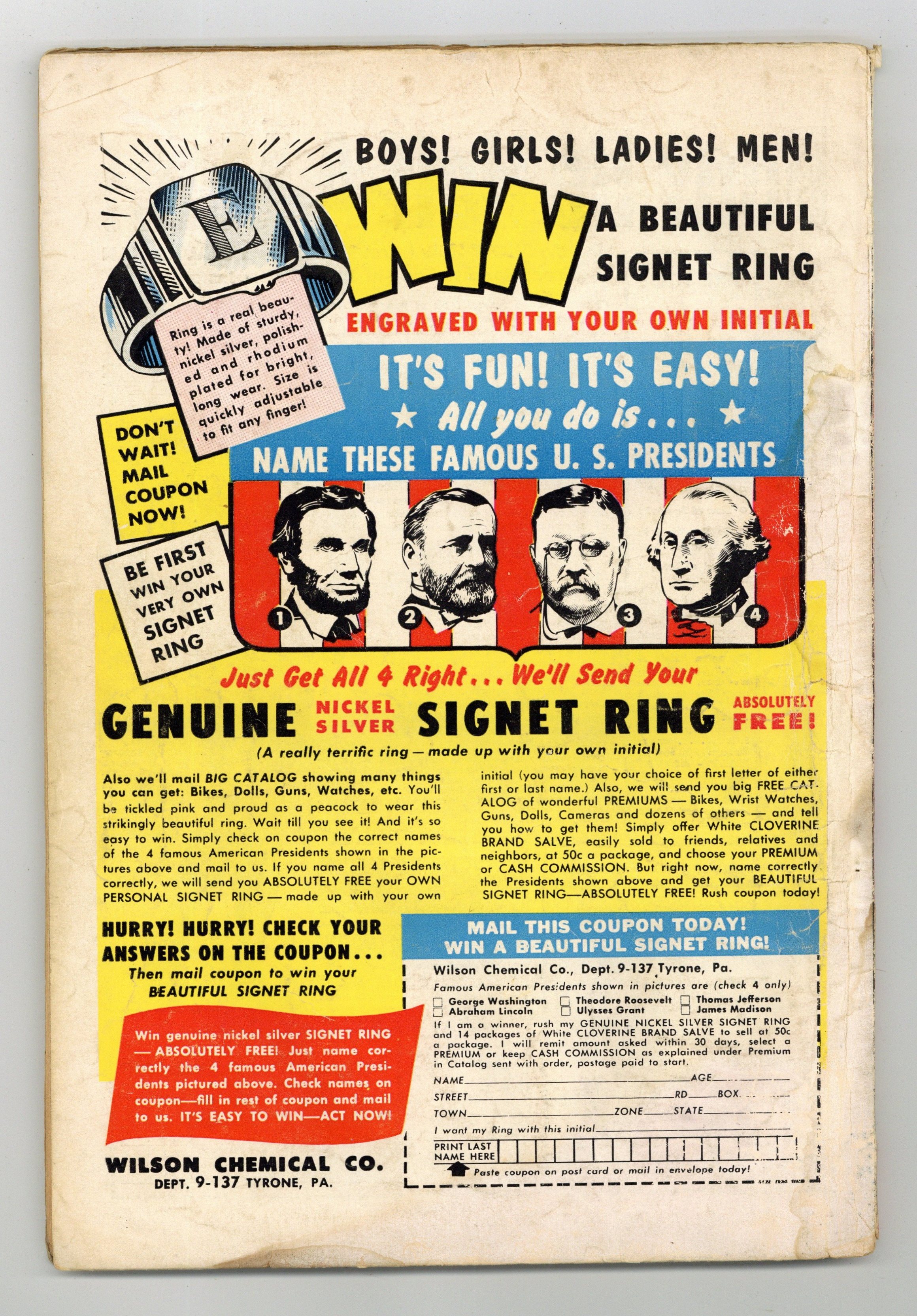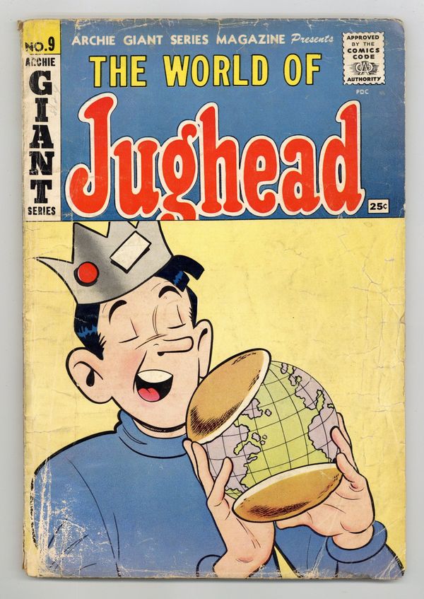 Regular edition with 25¢ cover price. American Edition 25¢ cover price. The World of Jughead. Cover by Samm Schwartz. "You Can't Win," script by Frank Doyle, pencils by Bill Vigoda, inks by Martin Epp; Jughead and Archie plot to get Veronica to forgive Archie by Archie defending her against Jughead's insults. "Foreign Entanglement," script by George Gladir, pencils by Bill Vigoda; Jughead poses as a French count on the phone to get Veronica to back out of her date with Archie, so he can go to a basketball game with Jughead. "Big Spending" one-page Li'l Jinx story by Joe Edwards. "Victory At the Polls," art by Samm Schwartz; Jughead tries to get Reggie elected junior class President by running him as a mystery candidate whose identity will only be revealed if he wins. "Rock and Rile," script by George Gladir, pencils by Bob White (page 1) and Dan DeCarlo (pages 2-6), inks by Bob White (page 1) and Vincent DeCarlo (pages 2-6); Archie's plans for a romantic jaunt in the country are ruined when Veronica invites Jughead along. "Togetherness," script by Frank Doyle; Reggie convinces Jughead that since Jughead and Archie are good friends and that opposites attract, his friendship with Archie means he's a terrible person. 84 pgs., full color. Cover price $0.25.