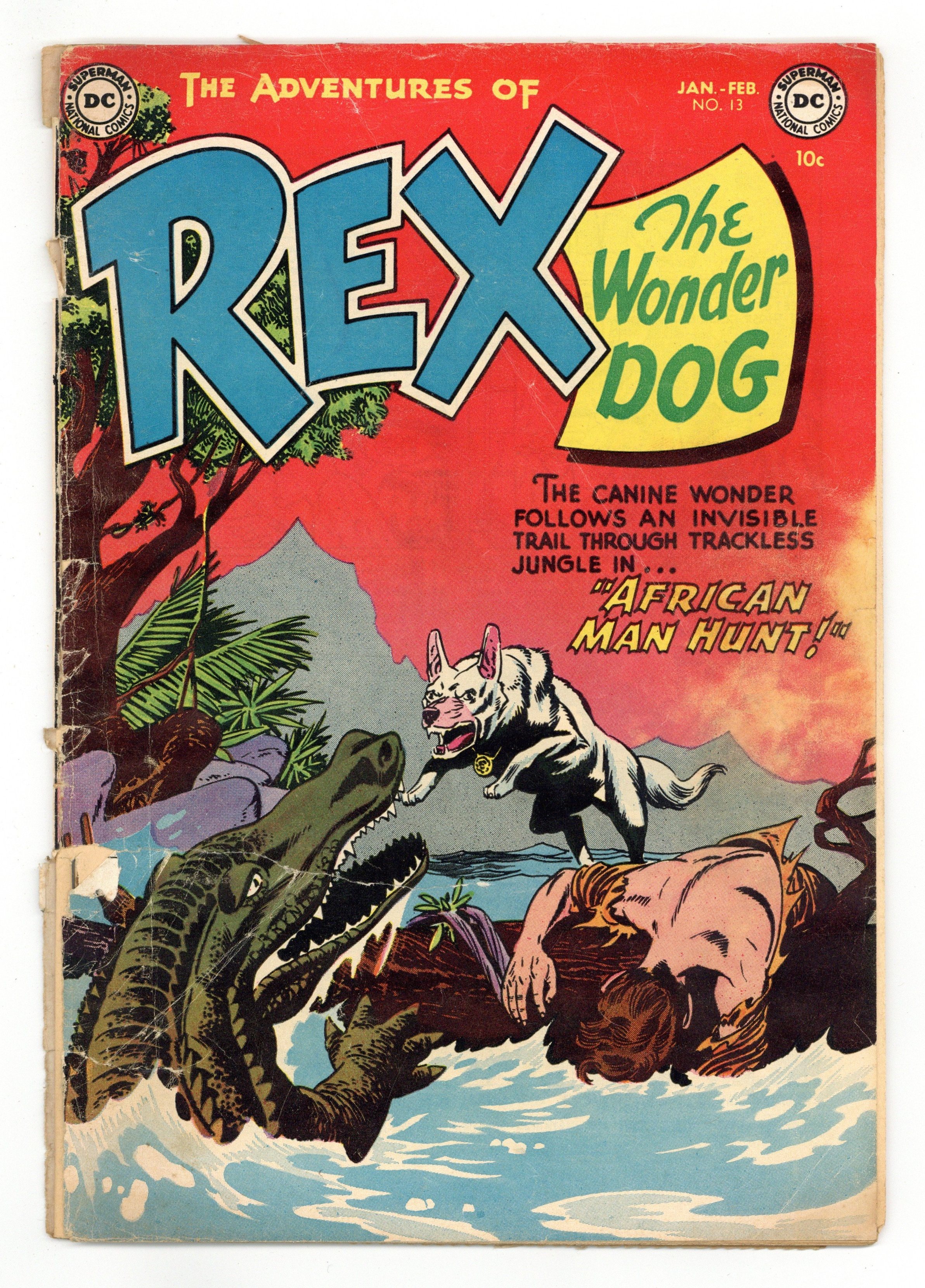 "African Man Hunt!" Major Dennis gets captured by African natives, prompting Rex to don a mask to scare off the superstitious tribe. Rex also battles wild creatures. Also includes: "The Case of the Runaway Ostrich!" (starring Detective Chimp); "Island of the Giants" (starring Rex); and "Canines against Crime!" Script by Robert Kanigher and John Broome, pencils by Gil Kane and Carmine Infantino, inks by Sy Barry and Joe Giella. Cover by Kane and Barry. Cover price $0.10.