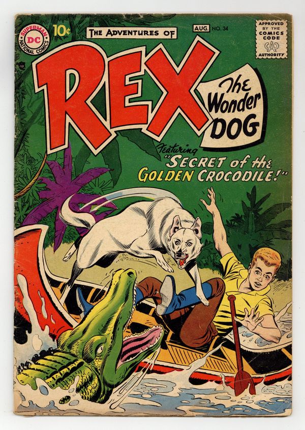 "The Secret of the Golden Crocodile!" Danny and Rex travel to Africa, where they discover a golden crocodile in a hidden cave. During the journey, Rex rescues Danny from a real Crocodile. Also includes: "The Case of the Chimpanzee's Camera!" (starring Detective Chimp); "Rex's Amazing Treasure Hunt!"; and "The Canny Crocodiles." Script by Bob Haney and John Broome, pencils by Gil Kane and Carmine Infantino, inks by Bernard Sachs. Cover by Kane and Sachs. Cover price $0.10.