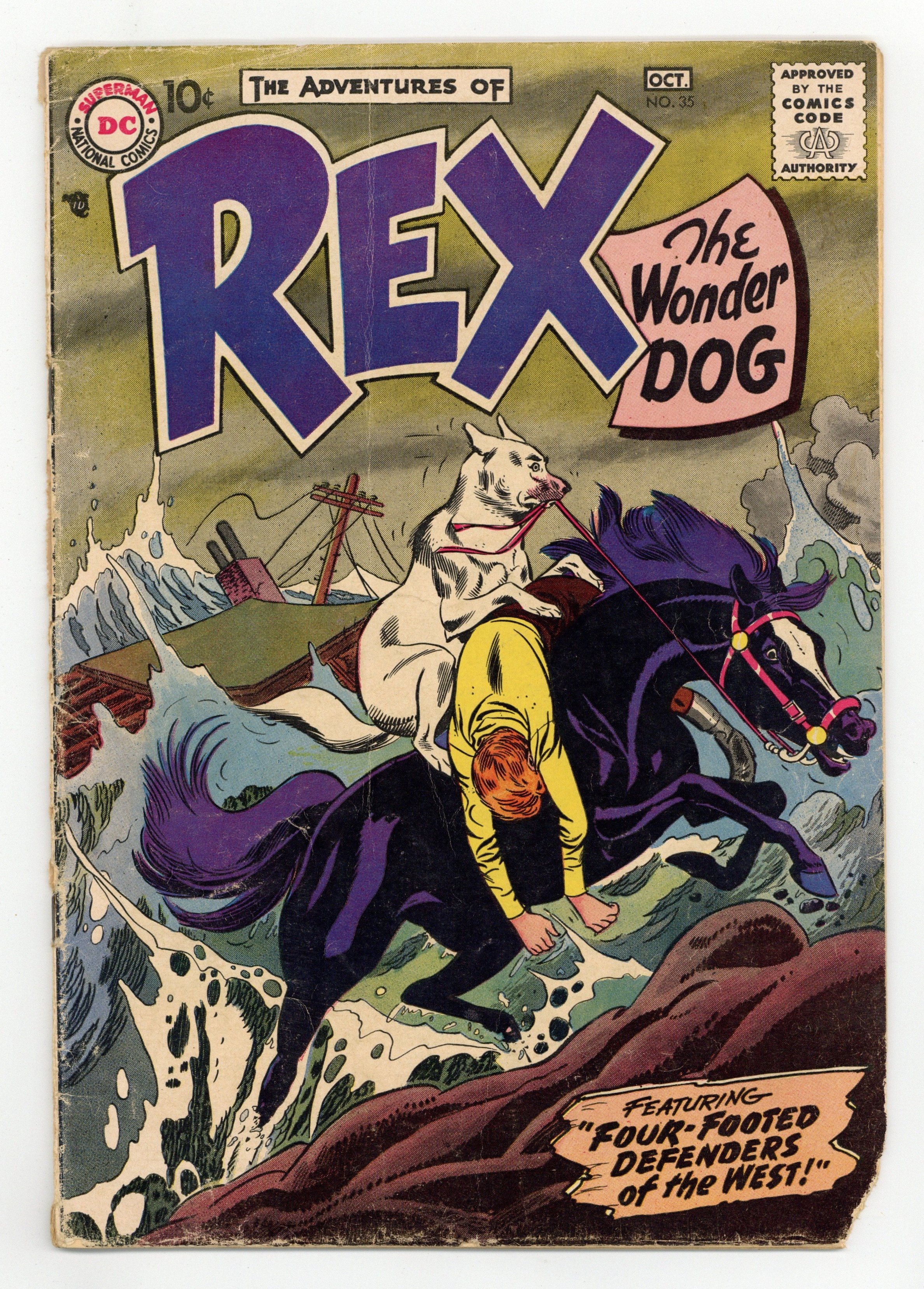 "Rex, M.D.!" While accompanying ambulance driver Dr. Chambers, Rex helps with an accident by pulling victims to safety, rescues women trapped in a burning building, and stops an escaped killer. Also includes: "Bobo's New York Adventure!" (starring Detective Chimp); "Four-Footed Defenders of the West!"; and "Big Game Hunters." Script by Robert Kanigher and John Broome, pencils by Gil Kane and Carmine Infantino, inks by Bernard Sachs. Cover by Kane and Sachs. Cover price $0.10.