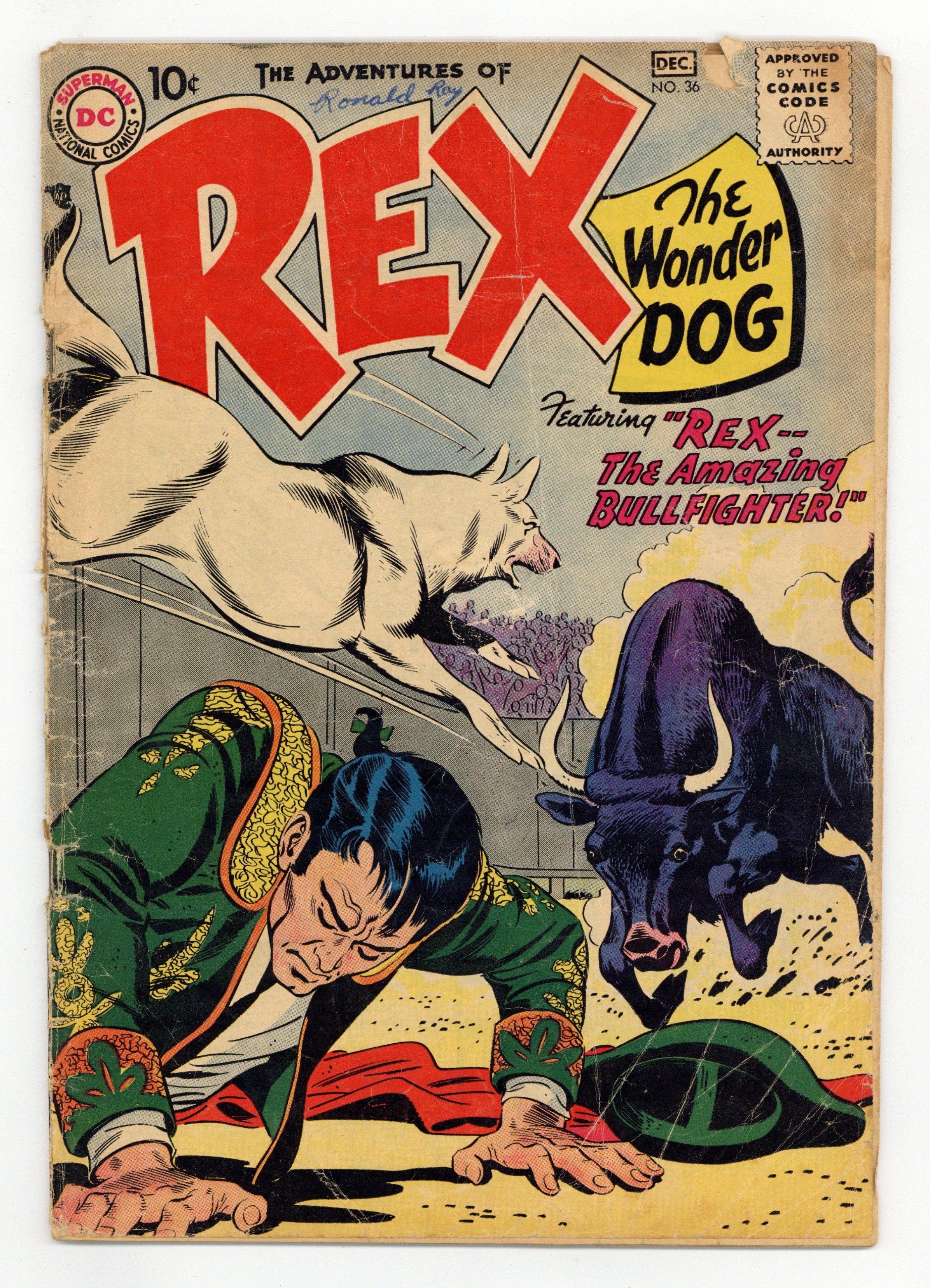 "Rex, the Amazing Bullfighter!" While on an adventure in Latin America, Rex, Danny, and the Major rescue a Mexican girl named Hermanita from a runaway horse. She then rewards them to a bullfight, where Rex steps in for the injured matador, impressing Hermanita's dog in the process. Also includes: "The Mystery of the Missing Missile!" (starring Detective Chimp); "Trail of the Jungle Amazons"; and "Canine Quiz." Script by Bob Haney and John Broome, pencils by Gil Kane and Carmine Infantino, inks by Bernard Sachs and Joe Giella. Cover by Kane and Sachs. Cover price $0.10.