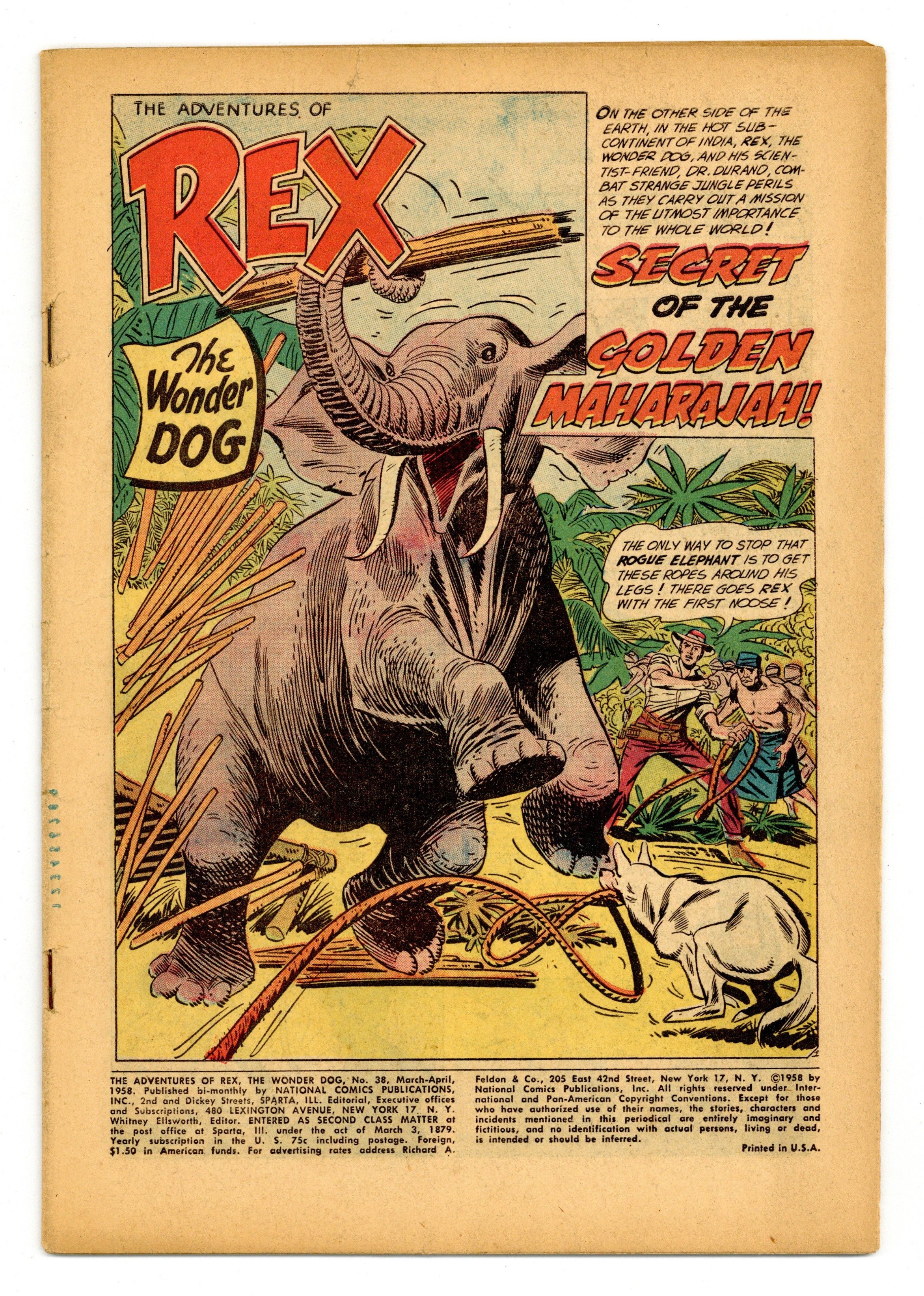 Ends Mar 16 7:07 PM CST Bid History 2 bids Current Bid $6 Your Secret Max Bid If you'd like to bid, please log in or register. "Secret of the Golden Maharajah!" Dr. Durand and Rex venture to India, where Durand hopes to convince the Maharajah to build a scientific observatory. Meanwhile, the Crowder Brothers plot to steal the Maharajah's gold. Also includes: "The Amazing Experiment of Professor Snodgrass!" (starring Detective Chimp); "Mystery Message from Nugget Ridge!" (starring Rex); and "Uncanny Canines." Script by John Broome, pencils by Gil Kane and Carmine Infantino, inks by Bernard Sachs. Cover by Kane. Cover price $0.10.