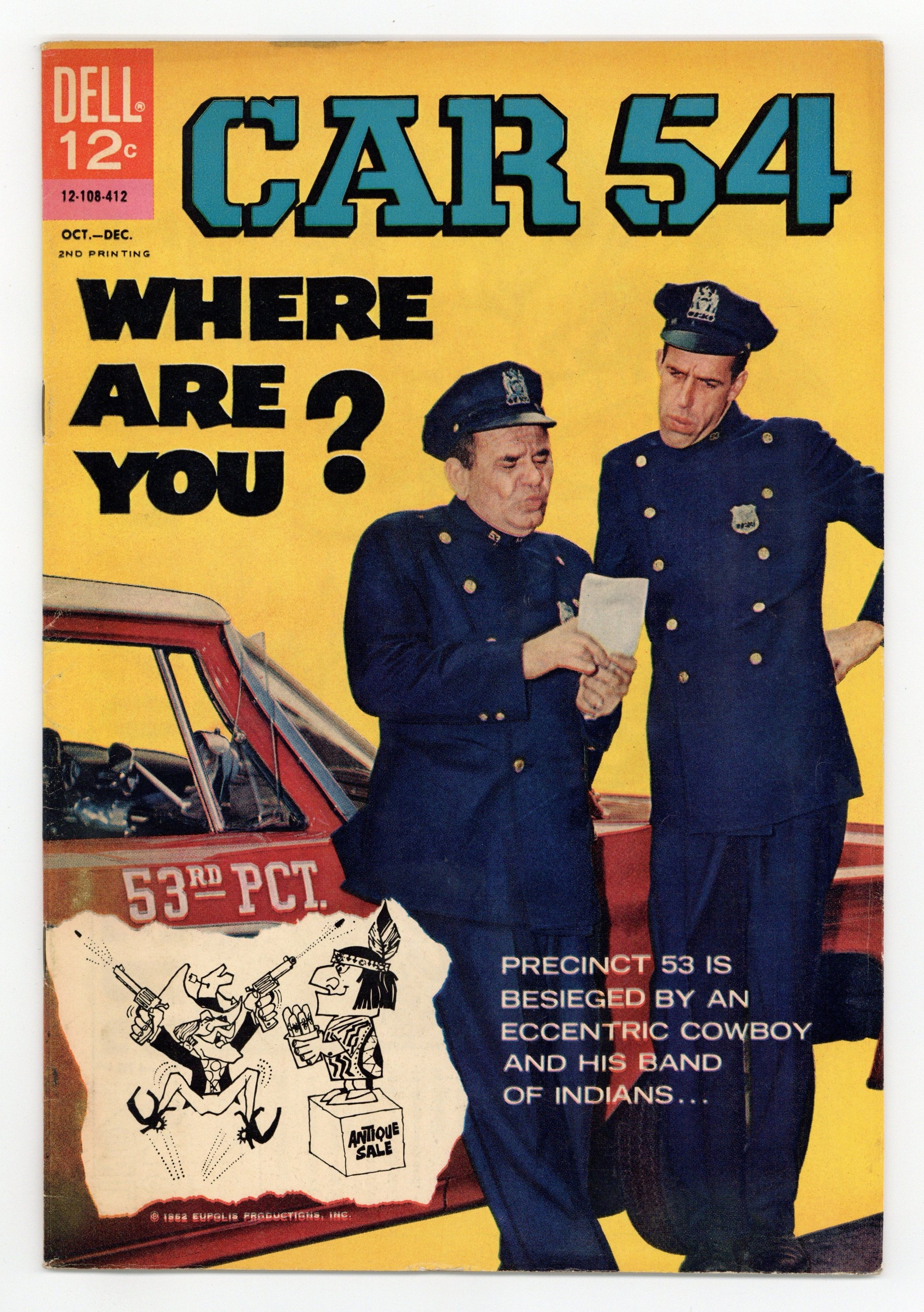 Second printing. Cover photo of Fred Gwynne and Joe E. Ross. Art by Tony Tallarico. Cover number is 12-108-210. Gunther and Muldoon are inept (or barely ept) cops working from Car 54, based on the 1960s TV sitcom. Just when it seems things can't get any weirder, Precinct 53 is invaded by an eccentric dressed as a cowboy and his band of "Indians." Walter starts his first day in public relations, before learning that he doesn't like working with the public. Muldoon thinks Gunther is losing his mind when he starts talking to Car 54. Car Versation; The Vanishing Furniture; The Day of the Kite; Walter Meets the Public; Sea Shore. 32 pages, Full Color. Cover price $0.12.