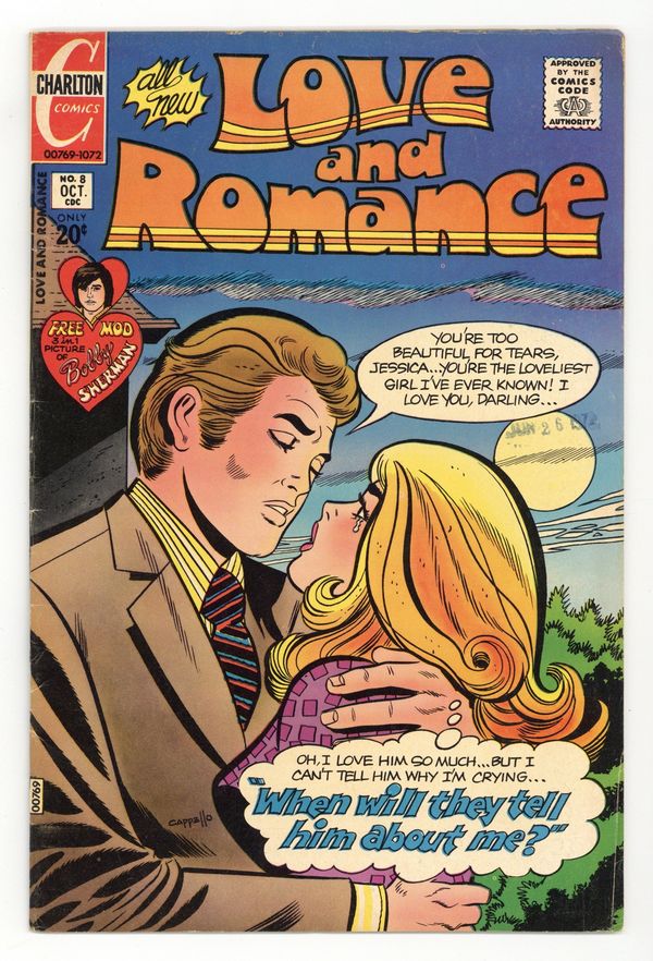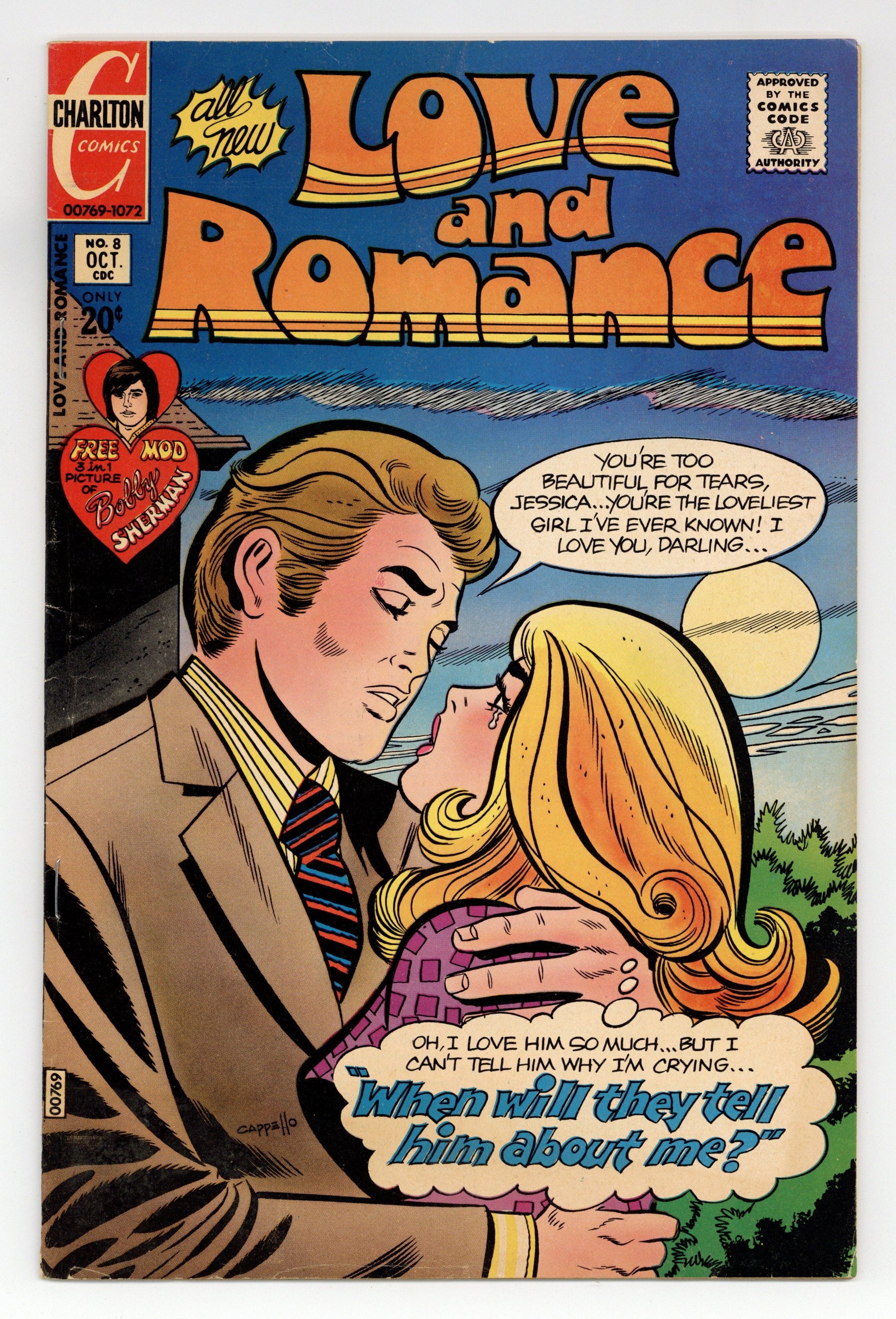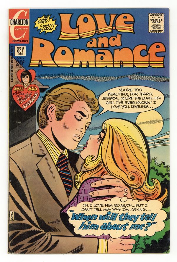 Published Oct 1971 by Charlton Comics Group.$14.00Cover by Art Cappello. Stories and art by Art Cappello, Fred Himes and Tony Tallarico. Women face the struggle of finding the right man, in romance comics that reflected the hairstyles and fashions of the 1970s. Cindy falls for handsome sailor Jonnie, who works for her father. Jessica has a dark secret that she can't bring herself to tell the man she loves. Plus a pinup of teen heartthrob Bobby Sherman (the second in two issues). Everything But Love; A Fence Built by Love; When Will They Tell Him About Me? 32 pages, Full Color. Cover price $0.20.