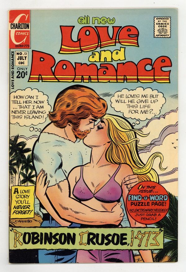 Cover by Art Cappello. Stories and art by Art Cappello, Tony Tallarico, Charles Nicholas and Vince Alascia. Women face the struggle of finding the right man, in romance comics that reflected the hairstyles and fashions of the 1970s. A woman meets a man who's been stranded on a remote island like a modern-day (1973, that is) Robinson Crusoe. They fall in love, but can she convince him to leave his island home? Grief leads to love for a couple. Too Good; A Sad Beginning; Robinson Crusoe, 1973. 32 pages, Full Color. Cover price $0.20.