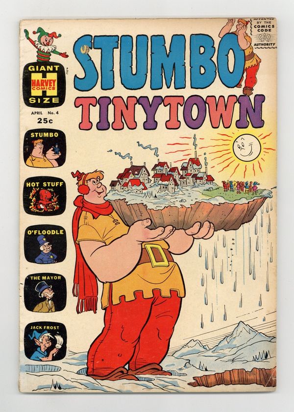 Dim but kind-hearted giant Stumbo tries to live peacefully with the people of Tinytown, despite being ten times their size. Stumbo springs into action when Tinytown is buried in a blizzard. Stumbo gets blamed by the townspeople after a volcano makes too much noise. Stumbo goes south, all the way to South America. Zoo, What?; A Fish Tale; Hot Stuff: The Wet World; The Shade Tree; Yellow Clay; Big Nuisance; Hot Stuff Fights Jack Frost; Hot Stuff: A Mountain of Trouble; Hot Stuff: The Land of the Flibbertygibbets; The Friendly Dragon; A Tale of TV; Rain, Rain Go Away! 68 pages, full color. Cover price $0.25.