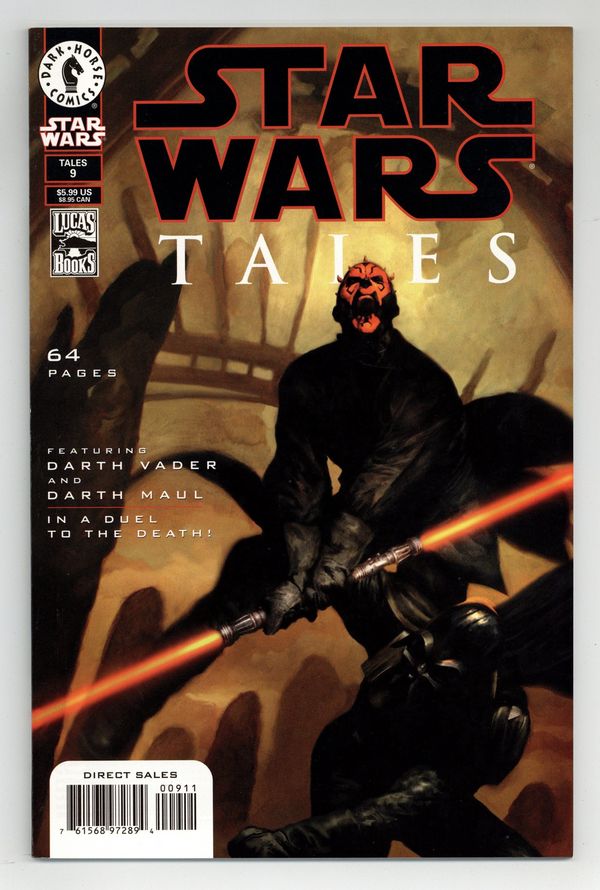 Featuring RON MARZ and RICK LEONARDI; cover by JON FOSTER. Ladies and Gentlemen! Boys and Girls! Droids and Jawas! Prepare yourselves for the battle of the century! In this corner, weighing in at 220 pounds, the terror from Tatooine, the Dark Lord of the Sith, the former Anakin Skywalker ? DARTH VADER! And in this corner, weighing in at 175 pounds, a killer of Jedi, the Naboo Annihilator, Darth Sidious' #1 apprentice? DARTH MAUL! Discover the answer to the question on everyone's lips: "Who's tougher? Darth Vader or Darth Maul?" Let the BATTLE begin! Cover price $5.99.