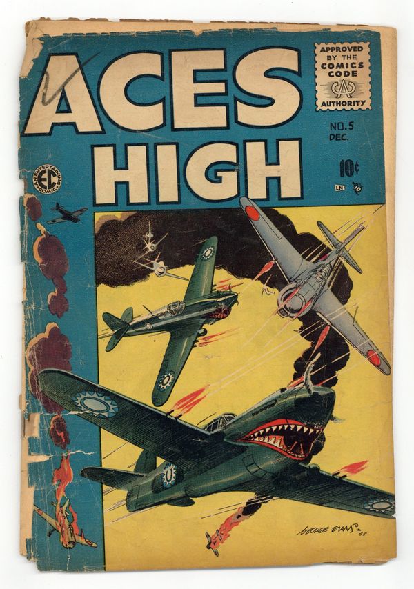 Cover art by George Evans. C'est La Guerre, art by George Evans; An American flight group roll dice to decide who will go on a suicide mission, and the French Captain cannot understand the Americans. Airman Unknown text story. Iron Man, art by Jack Davis; Fred Allison believes he can't be shot down. Spads Were Trump, script by Carl Wessler, art by Bernie Krigstein; Lt. Muller is the best ace in the group, but he seems to be afraid of the German ace named the Red Eagle. Ordeal, art by Wally Wood; Lieutenant Stoner, an experienced pilot, must do the one thing that scares him. 36 pgs. $0.10. Cover price $0.10.