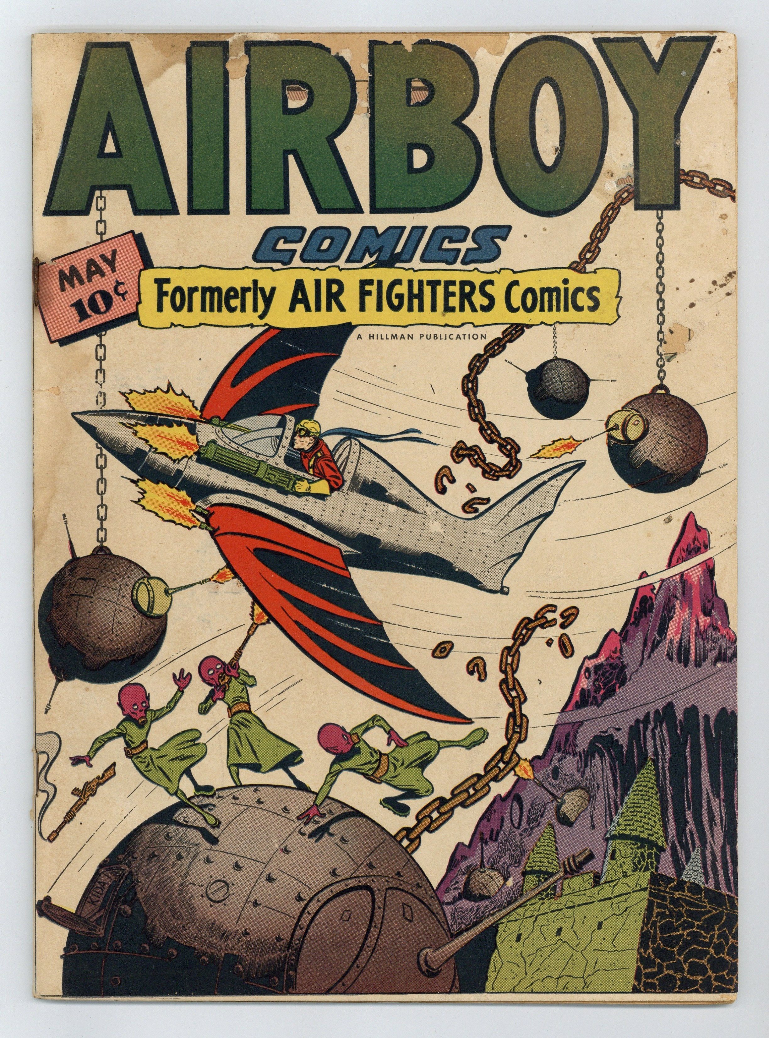 Cover by Fred Kida. Stories and art by Maurice Del Bourgo, Tony DiPreta, and E. Dorris. One of the more fanciful and influential of 1940s aviator heroes, Airboy fights evil with his radio-controlled plane "Birdie" and its plethora of experimental flying tech. Sometimes listed as Airboy Comics #27. No issue # on cover; Vol. 3, issue #4 in indicia.(There was no Vol. 3, issue #3.) Airboy investigates when blinded pilots stumble on a bandit's golden hoard. Flying Dutchman meets the Little People after crashing in Rip Van Winkle country. Sky Wolf learns a mad scientist has revived his old foe The Heap and used it for murder. This story served as a "backdoor pilot" for The Heap, launching a backup series in Airboy featuring comics' original muck-monster adventurer. Airboy; Skinny McGinty; Iron Ace; Flying Dutchman; The Man Who Forgot; Sky Wolf: The Return of the Heap. 52 pages, Full Color. Cover price $0.10.