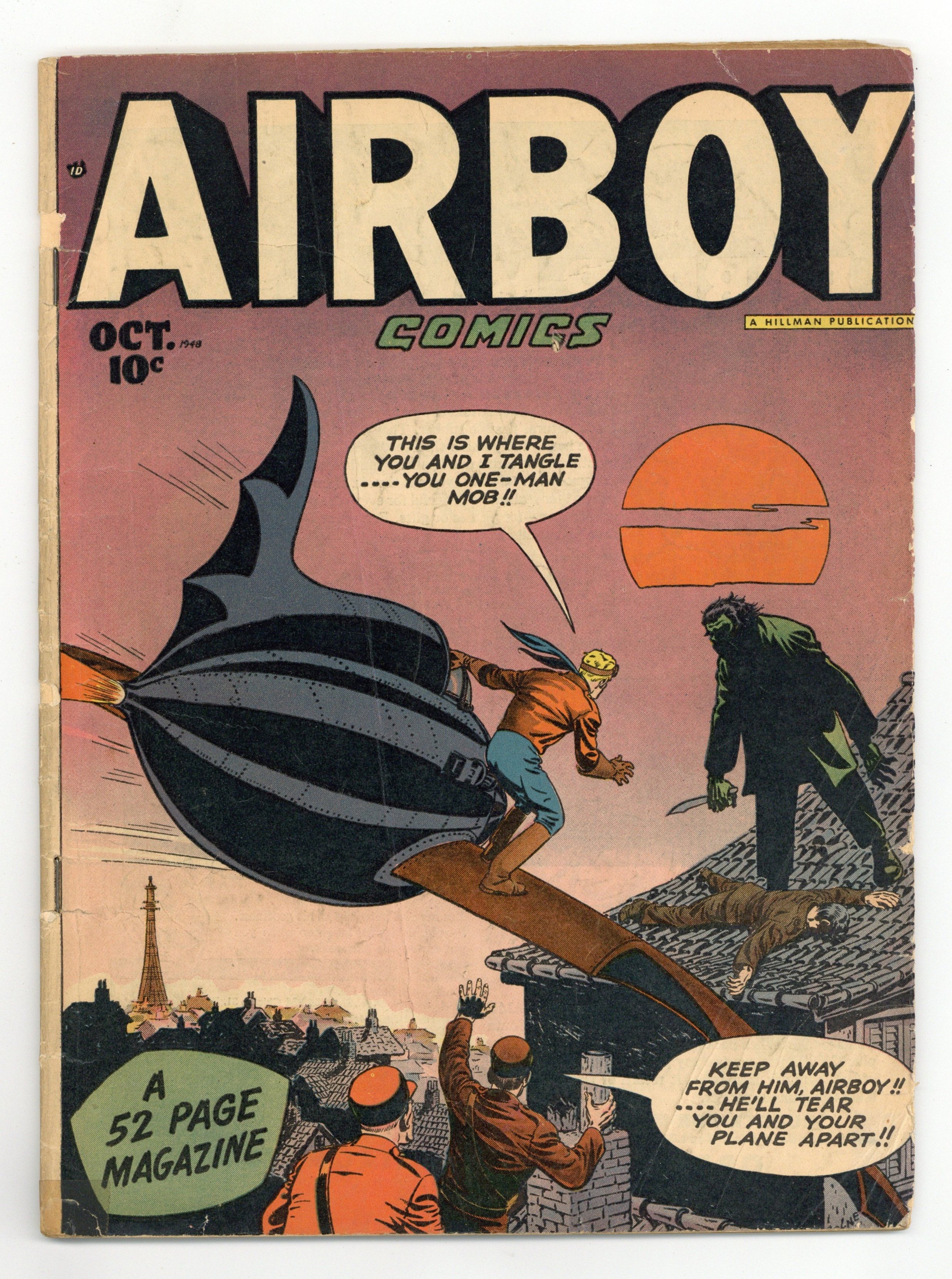 Cover by Dan Zolnerowich. Stories and art by Dick Wood, Dan Zolnerowich, Mike Roy, John Belfi and Leonard Starr. One of the more fanciful and influential of 1940s aviator heroes, Airboy fights evil with his radio-controlled plane "Birdie" and its plethora of experimental flying tech. Sometimes listed as Airboy Comics #56. No issue # on cover; Vol. 5, issue #9 in indicia. Airboy is hired to protect a spoiled rich girl who gotten in deep with gangsters over her gambling losses. A tribute to The Heap's human self, Baron von Emmelman, is interrupted by gauche outsiders, causing The Heap to go ballistic. The strange true story of Colonel Thomas Blood and his attempt to steal the Crown Jewels of England from the Tower of London in 1671. Airboy; The Flying Fool; The Heap; The Man Who Stole the King's Crown; Voyage into the Unknown; Naughty Murieta. 48 pages, Full Color. Cover price $0.10.