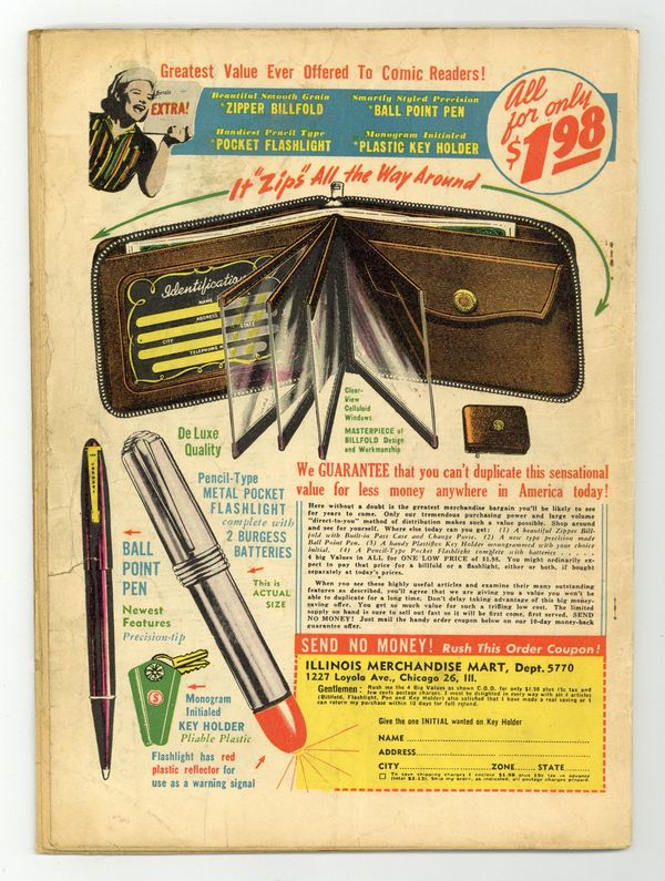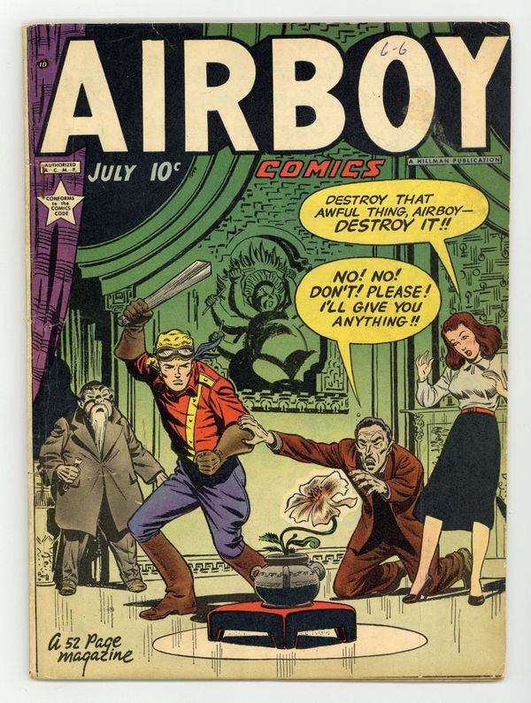 Cover by Ernest Schroeder. Stories and art by Leonard Starr, Frank Bolle, Jules Steiner, Alden McWilliams and Ernest Schroeder. One of the more fanciful and influential of 1940s aviator heroes, Airboy fights evil with his radio-controlled plane "Birdie" and its plethora of experimental flying tech. Sometimes listed as Airboy Comics #65. No issue # on cover; Vol. 6, issue #6 in indicia. Airboy investigates a mystery involving a millionaire, hospital medicine thefts, and a sacred Chinese flower. The mystic Belled Goose plays a key role, as the truth is finally revealed about the accident that transformed Baron Eric von Emmelman into The Heap. The true story of heroic sled dog Fury. Airboy; The Heap; Berthelot Island; Fury of the Northland; Judas the Goat; Good Neighbor; The Wateree's Wild Ride. 48 pages, Full Color. Cover price $0.10.