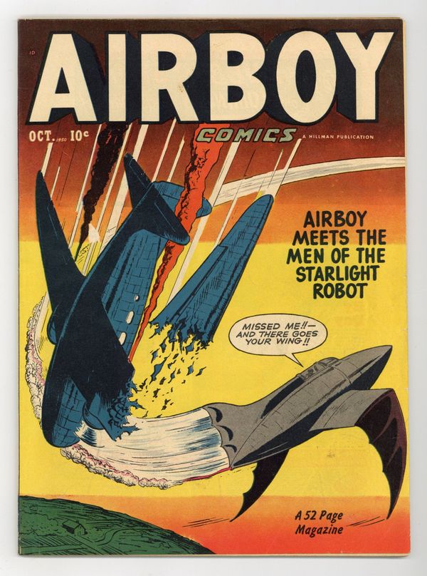 Cover by Ernest Schroeder. Stories and art by John Prentice, Gerald McCann and Ernest Schroeder. One of the more fanciful and influential of 1940s aviator heroes, Airboy fights evil with his radio-controlled plane "Birdie" and its plethora of experimental flying tech. Sometimes listed as Airboy Comics #80. No issue # on cover; Vol. 7, issue #9 in indicia. Airboy investigates the strange secret of the Starlight Robot, but crooks want to steal it out from under him. Pawnee soldiers temporarily join the US Army to defeat a Sioux attack that would be disastrous for both of them. The story of one medieval lad's journey from page to squire to knight. Airboy: The Men of the Starlight Robot; Pawnee Commandos; Swifty Chase; Hero of the Tashmoo; A Knight Is Made. 48 pages, Full Color. Cover price $0.10.