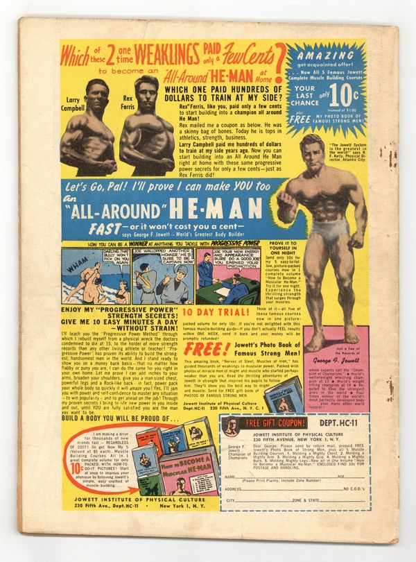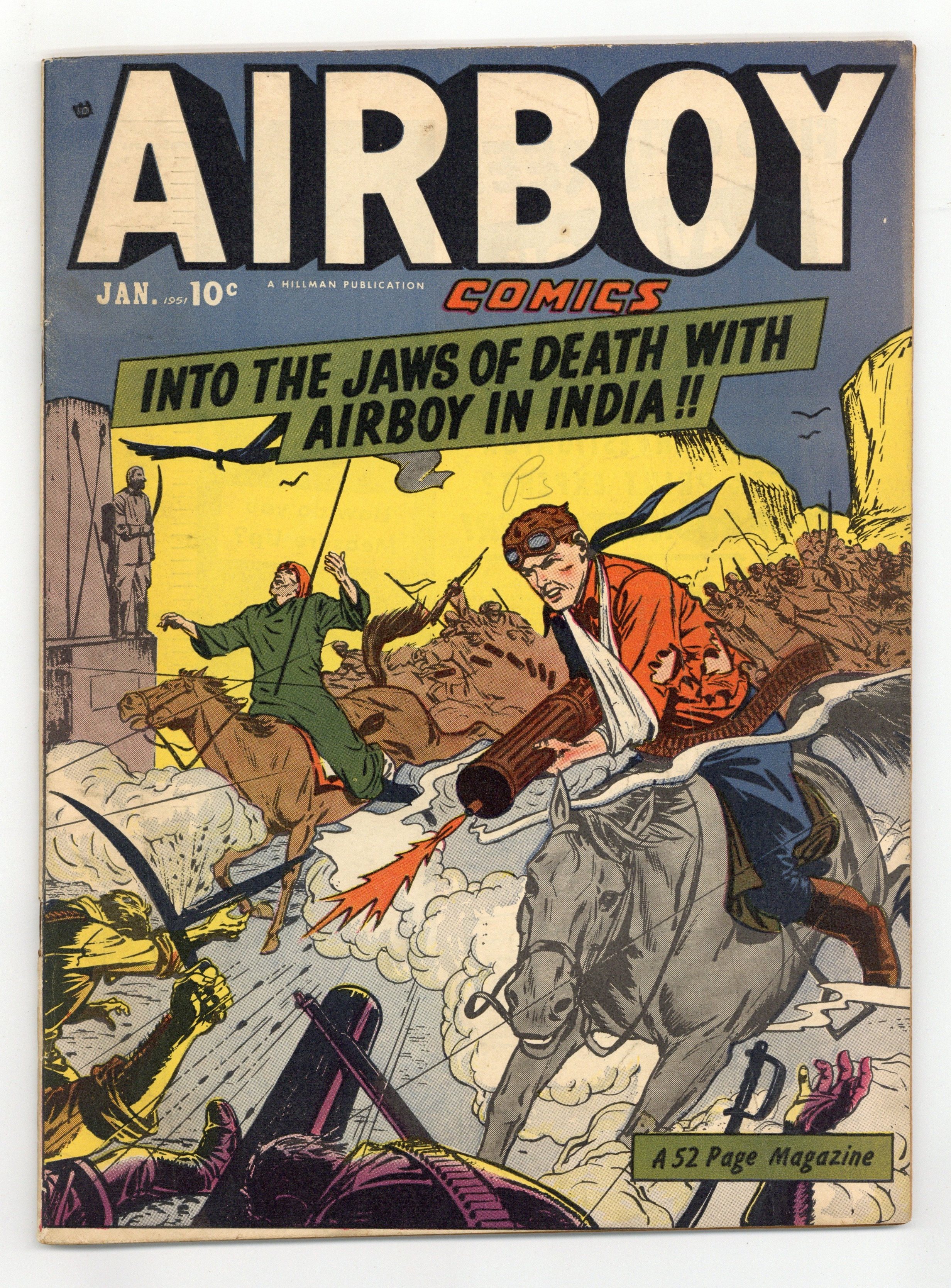 $41.00Cover by Ernest Schroeder. Stories and art by Floyd Torbert and Ernest Schroeder. One of the more fanciful and influential of 1940s aviator heroes, Airboy fights evil with his radio-controlled plane "Birdie" and its plethora of experimental flying tech. Sometimes listed as Airboy Comics #83. No issue # on cover; Vol. 7, issue #12 in indicia. Airboy gets involved in a family feud involving his grandfather, Capt. Randolph Nelson, and a catastrophic battle in India. The Heap takes action to release a village from the ghostly hands of a vengeful duke. The semi-true tale of how the Romans finally defeated the war elephants of Hannibal, the Carthaginian military genius. Airboy; The Heap; Swifty Chase; Hannibal's Last Battle; Baskets By the Dozen; The Pigeons of Paris; The Gun Grows Up. 48 pages, Full Color. Cover price $0.10.