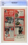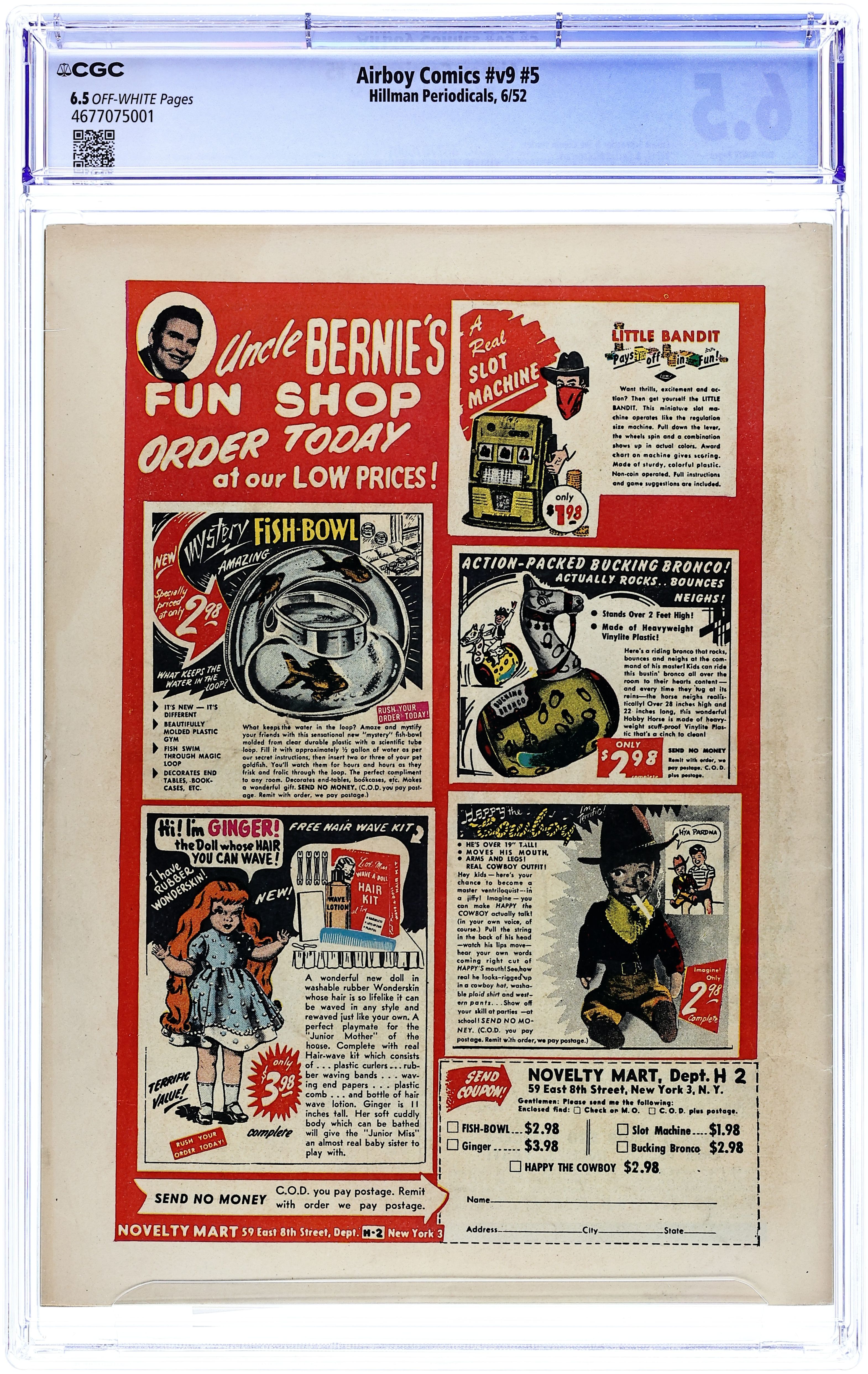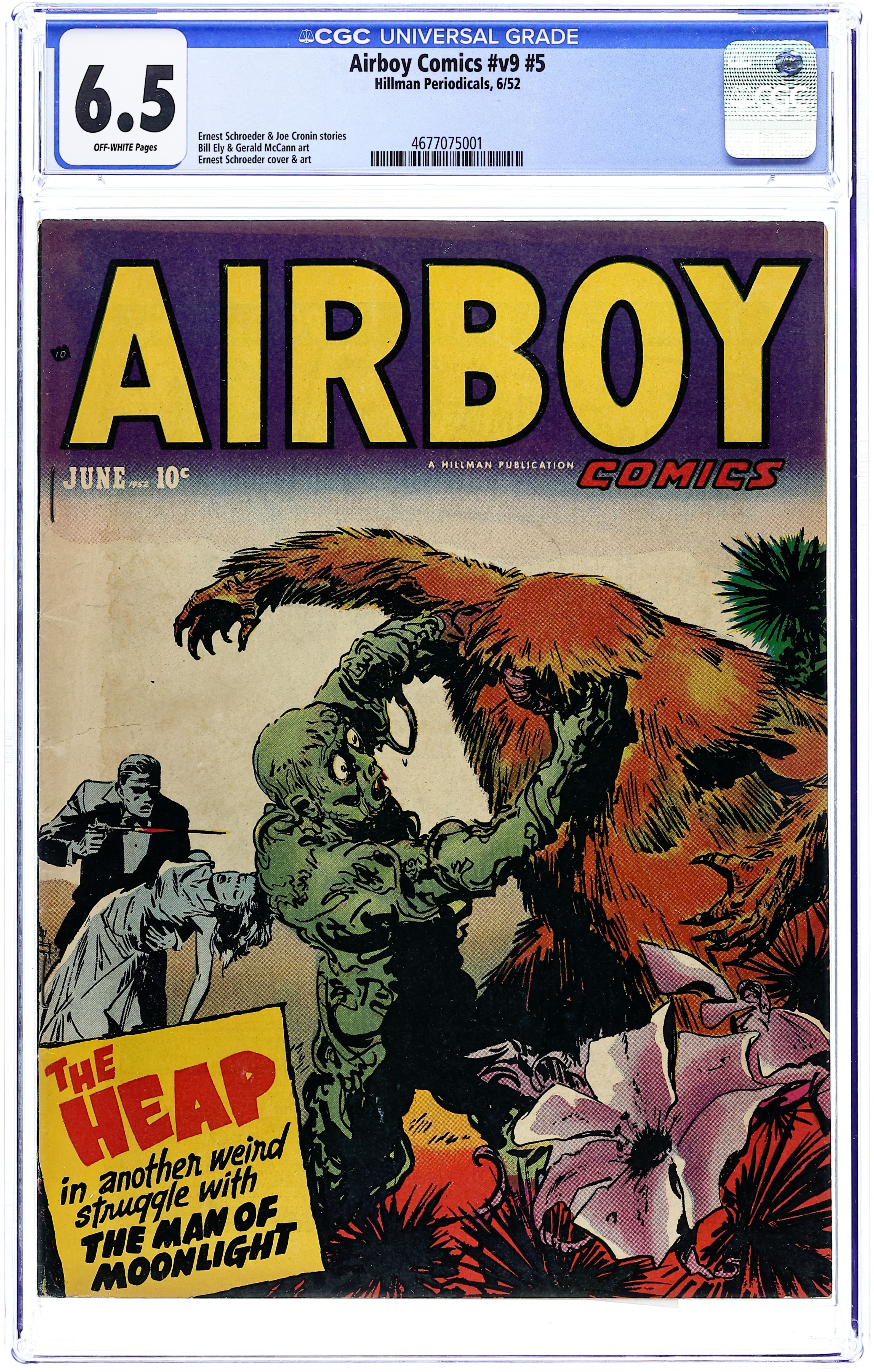 Cover by Ernest Schroeder. Stories and art by Bill Ely, Gerald McCann, Ed Cronin and Ernest Schroeder. One of the more fanciful and influential of 1940s aviator heroes, Airboy fights evil with his radio-controlled plane "Birdie" and its plethora of experimental flying tech. Sometimes listed as Airboy Comics #100. No issue # on cover; Vol. 9, issue #5 in indicia. Airboy goes undercover in a nuclear sub factory to catch a saboteur. A colonial lord in North Africa uses strange moonlight plants to return from the dead, drawing the attention of The Heap. A Balkan couple raises a boy who has been bitten by a werewolf. Airboy; The Heap: The Man of Moonlight; Money Facts; The Wolf Boy of Krakow; The Bag Man; The Crown of Coort. 36 pages, Full Color. Cover price $0.10.