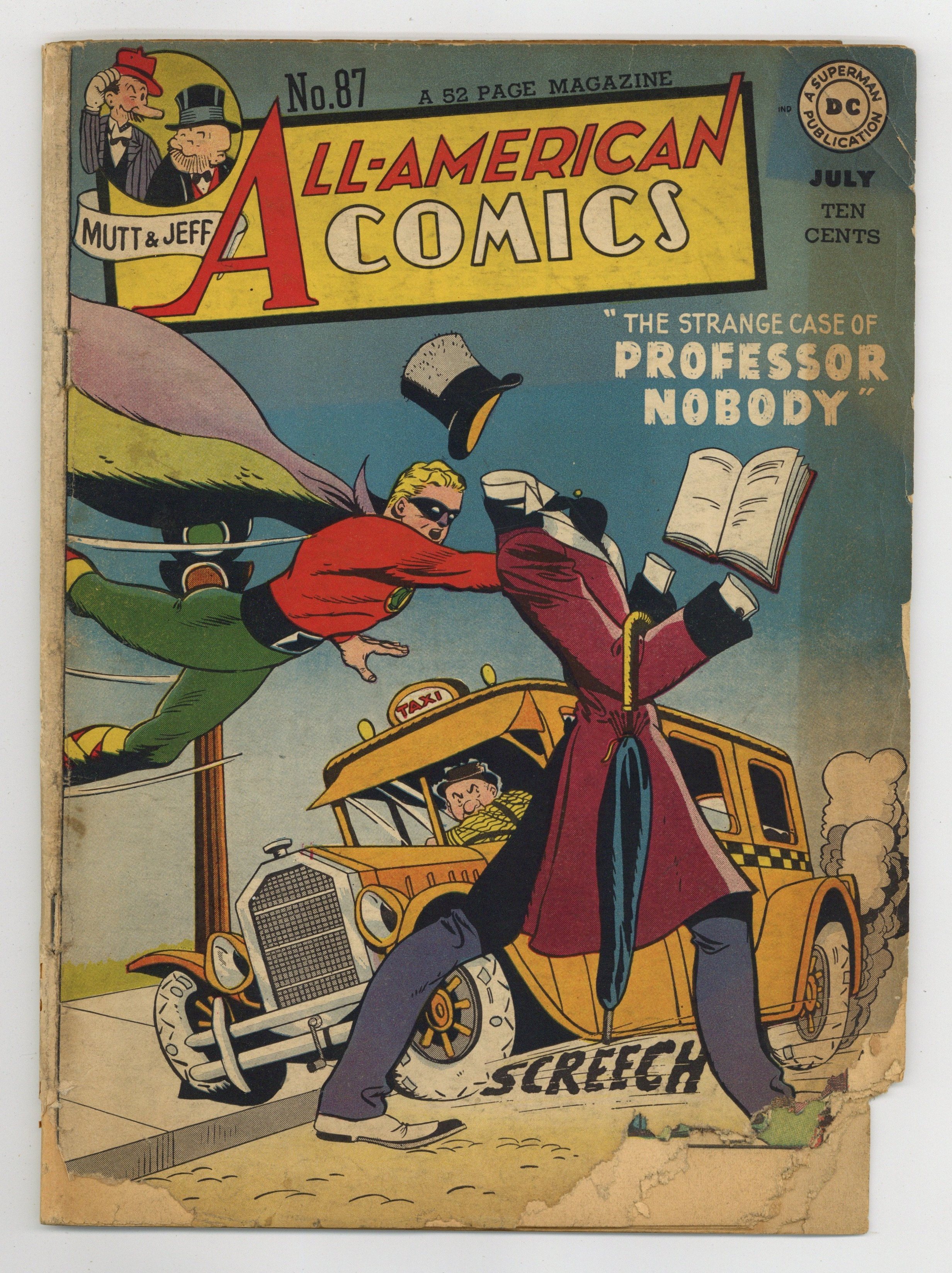 Cover art by Paul Reinman. Strange Case of Professor Nobody, script by John Broome, art by Paul Reinman; Doiby bets Alan that a single day could go by without trouble requiring the services of Green Lantern; Then he meets Professor Nobody! How Dr. Mid-Nite Captured Big Shot Barnes, art by Frank Harry. Brother against Brother starring The Black Pirate, art by Paul Reinman. Pie Is a Man's Just Dessert starring Hop Harrigan, script and art by Jon L. Blummer. Mutt and Jeff strips by Al Smith [signed as Bud Fisher]. 52 pgs. $0.10. Cover price $0.10.