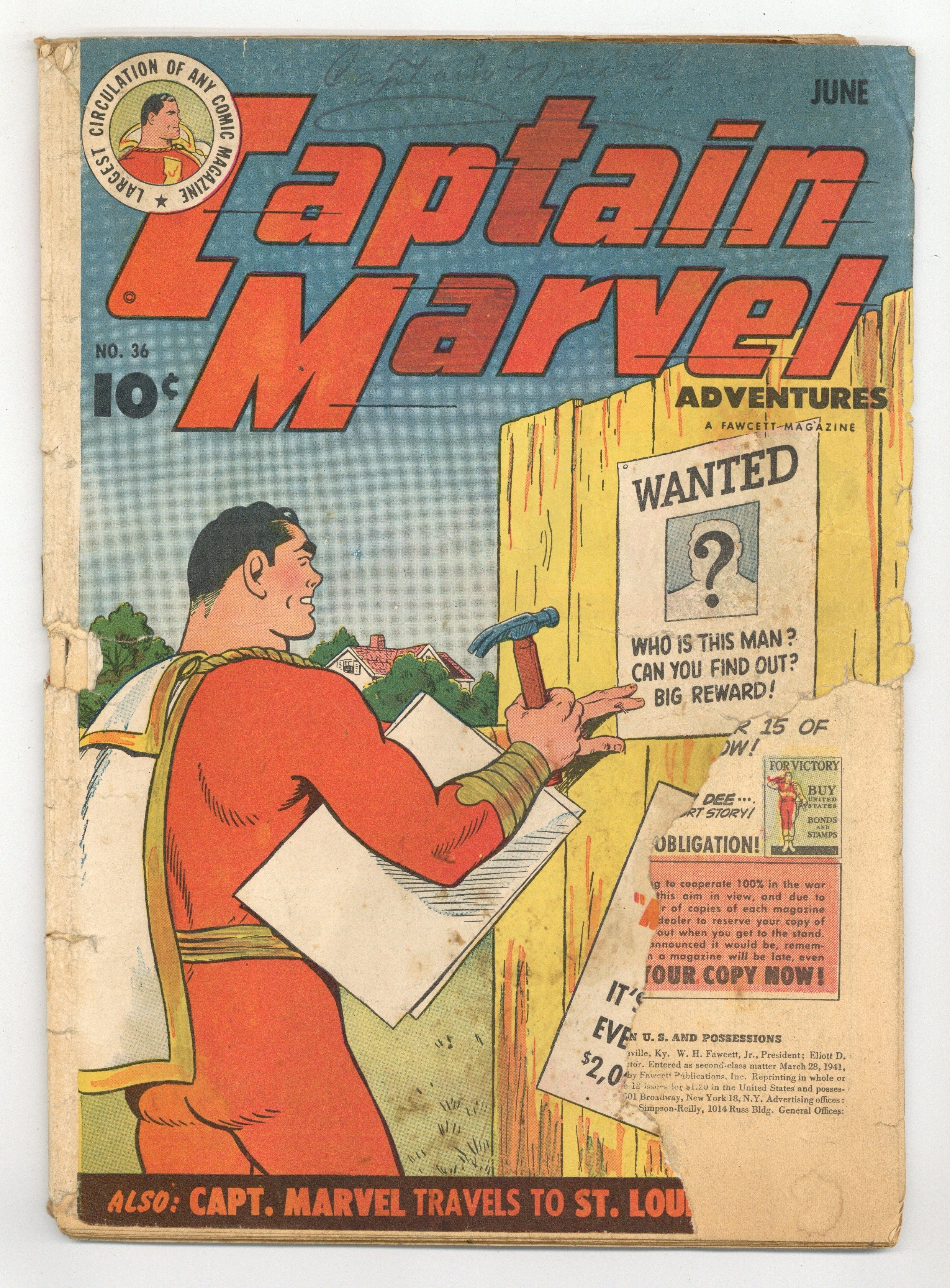 Cover by C.C. Beck. Stories by Otto Binder and unknown. Art by C.C. Beck, C.C. Beck Studio and unknown. Captain Marvel tracks Mr. Mind to an English castle, where the owner offers his help. However, the butler is a member of the Monster Society who has helped Mr. Mind construct a giant drill that burrows into the earth to release a flood of lava and Captain Marvel can only stop it by sitting on the new volcano in "The Monster Society of Evil Chapter 15: The Vicious Volcano!" by Otto Binder and C.C. Beck. Plus: By a weird trick of fate, the water from the Lost River changes Billy into a wild animal, but gives Steamboat remarkable intelligence in "The Mystery of Lost River" with art by C.C. Beck and C.C. Beck Studio. Captain Marvel also stars in "The St. Louis Cup" (St. Louis, MO city story) and "The One-Man Transportation System"! Plus: Captain Marvel "Missing Face Contest No. 1" 1-pager. And: 2-page text story "Bombs Over London" by Gary Brown. 52 Pages, Full Color. Cover price $0.10.